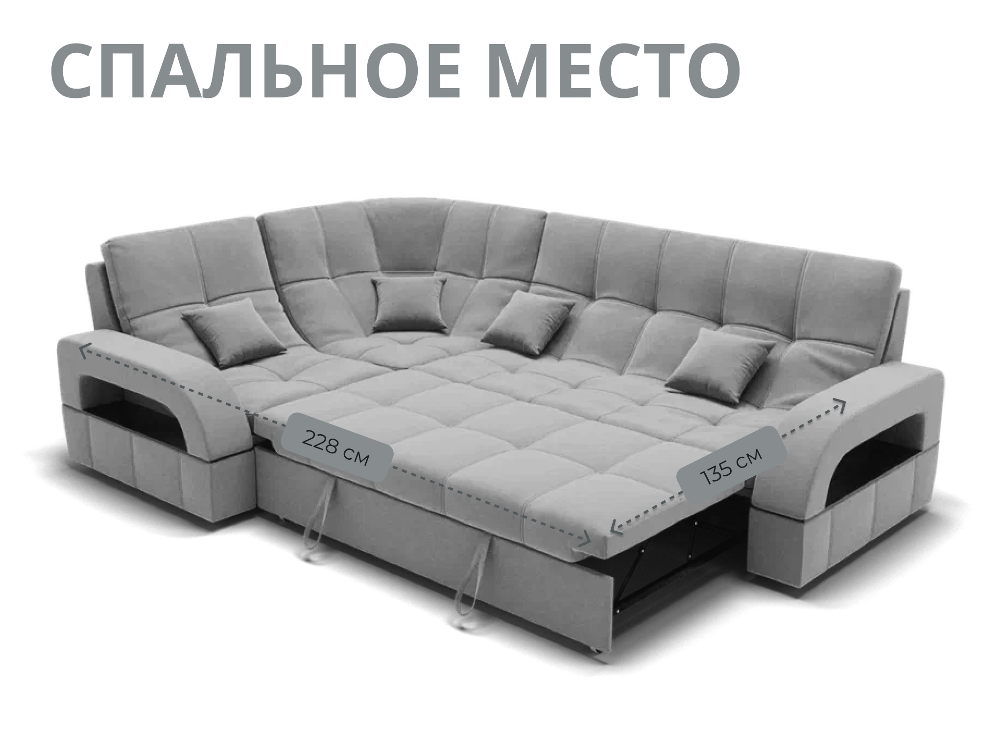 Спальное место имеет ширину 135 см и длину 211 см. Он предназначен для двух человек и имеет глубину сиденья 65 см. Максимальная нагрузка на диван составляет 280 кг.