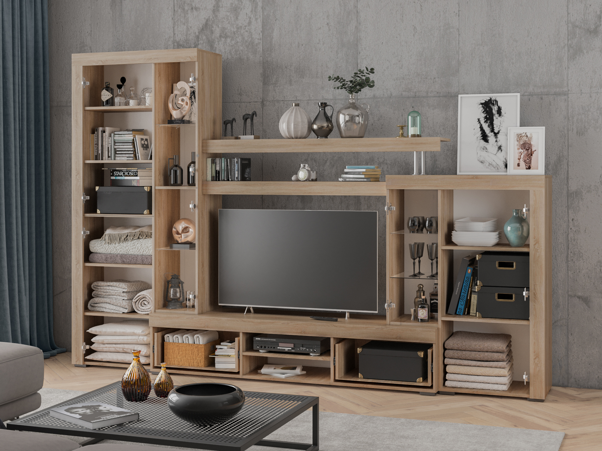Гостиный гарнитур "Маркус" сочетает в себе одновременно простоту и функциональность, что позволяет, в свою очередь, с комфортом обустроить ТВ-зону в гостиной и решить проблему хранения множества вещей.