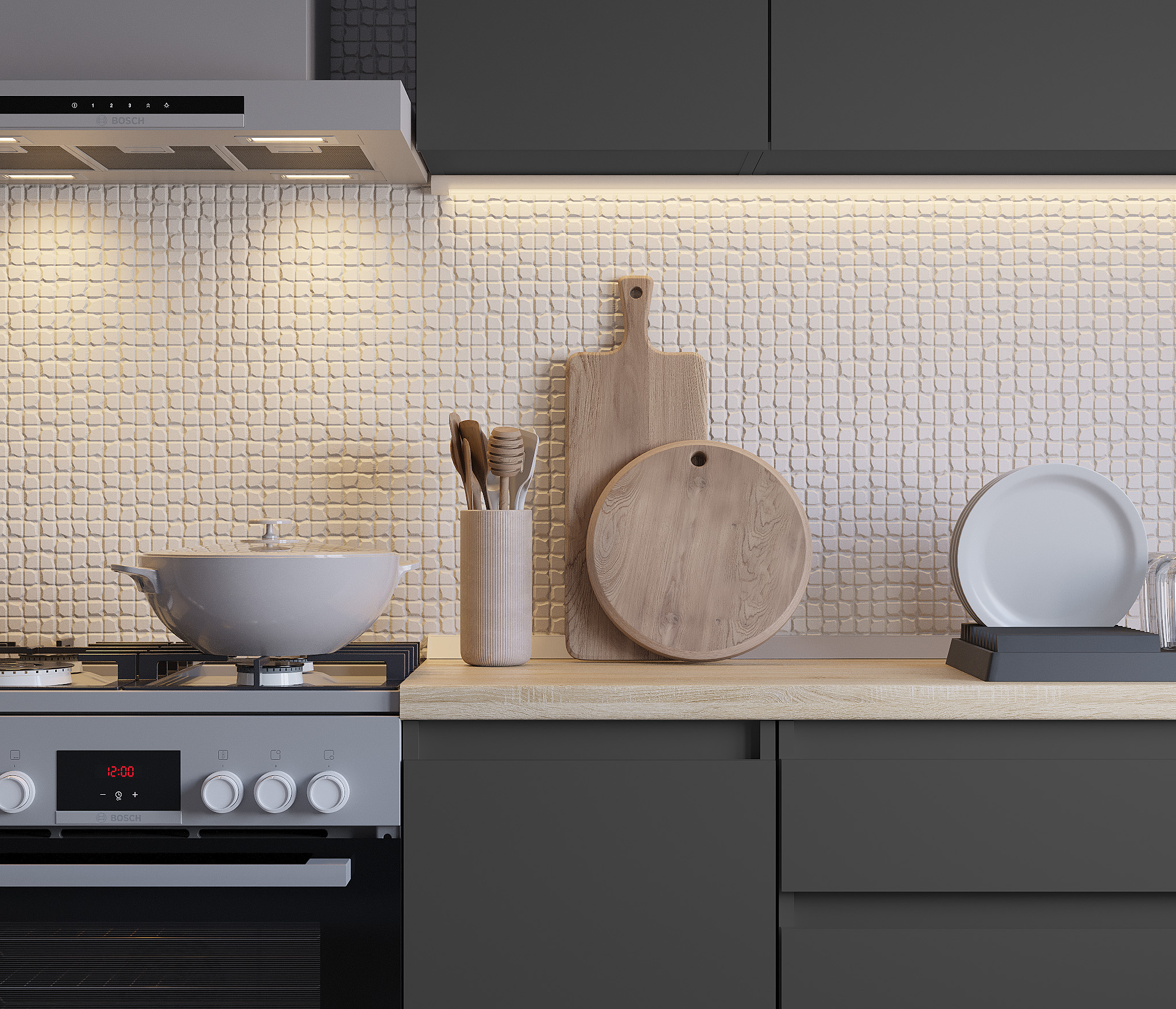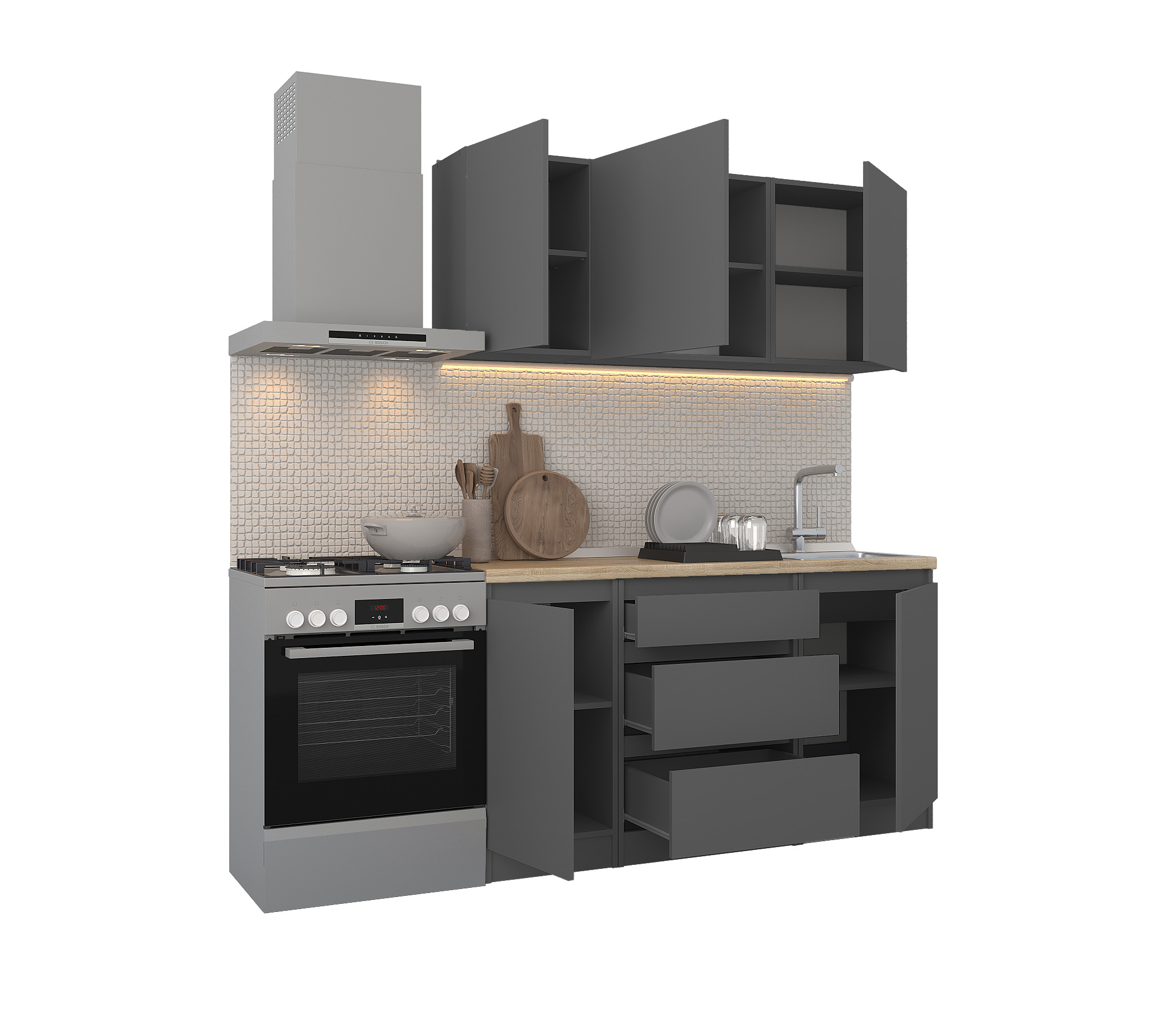 Обратите внимание, что столешница, стеновая панель, мойка и смеситель не входят в комплектацию кухни Леон и приобретаются отдельно. Это позволяет вам выбрать идеальные аксессуары и элементы для создания индивидуального дизайна вашей кухни.