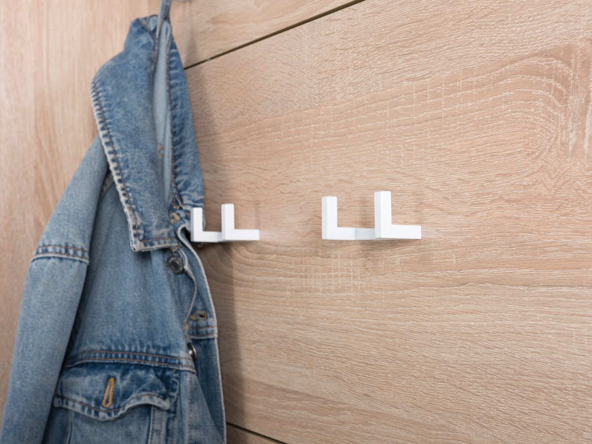 Компактная, настенная вешалка выполнена в виде панели с полкой и тремя стильными, пластиковыми двухрожковыми крючками для одежды.