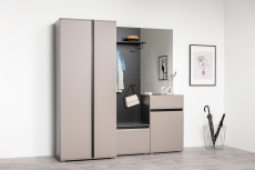 Сидней – стильная и функциональная прихожая, которая масштабируется под любую площадь помещения и высоту потолков. Минималистичные фасады в трендовом цвете без лицевой фурнитуры открываются за край либо нажатием (push-to-open). Большой выбор модулей: высота шкафов от 2050 до 2400 мм и полноразмерная глубина позволит максимально использовать полезное пространство. Вместительная система для хранения одежды, обуви и хозяйственных принадлежностей. Цветовое решение: ЛМДФ 16 мм Веллюто Капучино; ЛДСП 16 мм Антрацит.