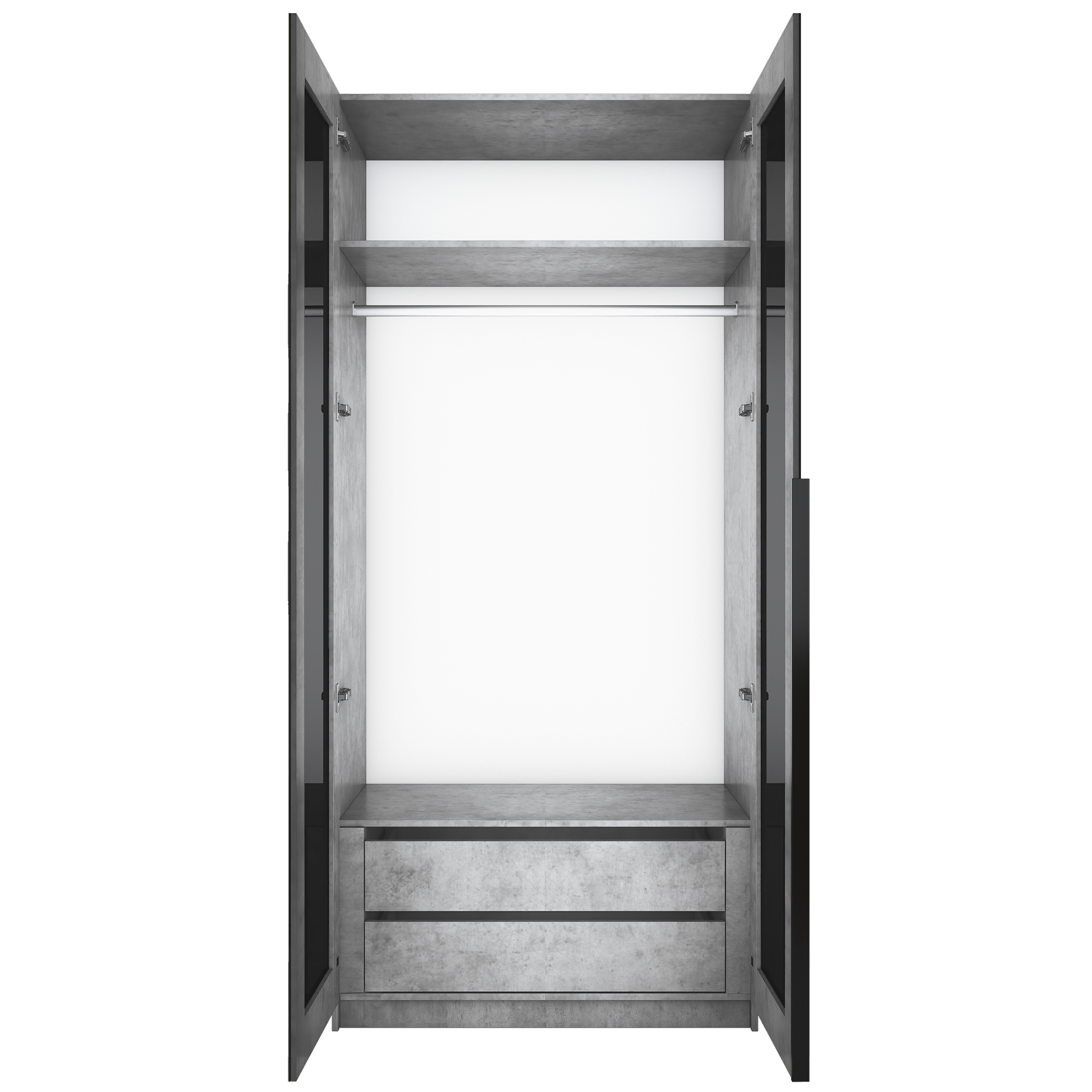 Фасады шкафа изготовлены из стекла черного цвета, оклеенного противоосколочной пленкой с внутренней рамкой из ЛДСП Бетон.