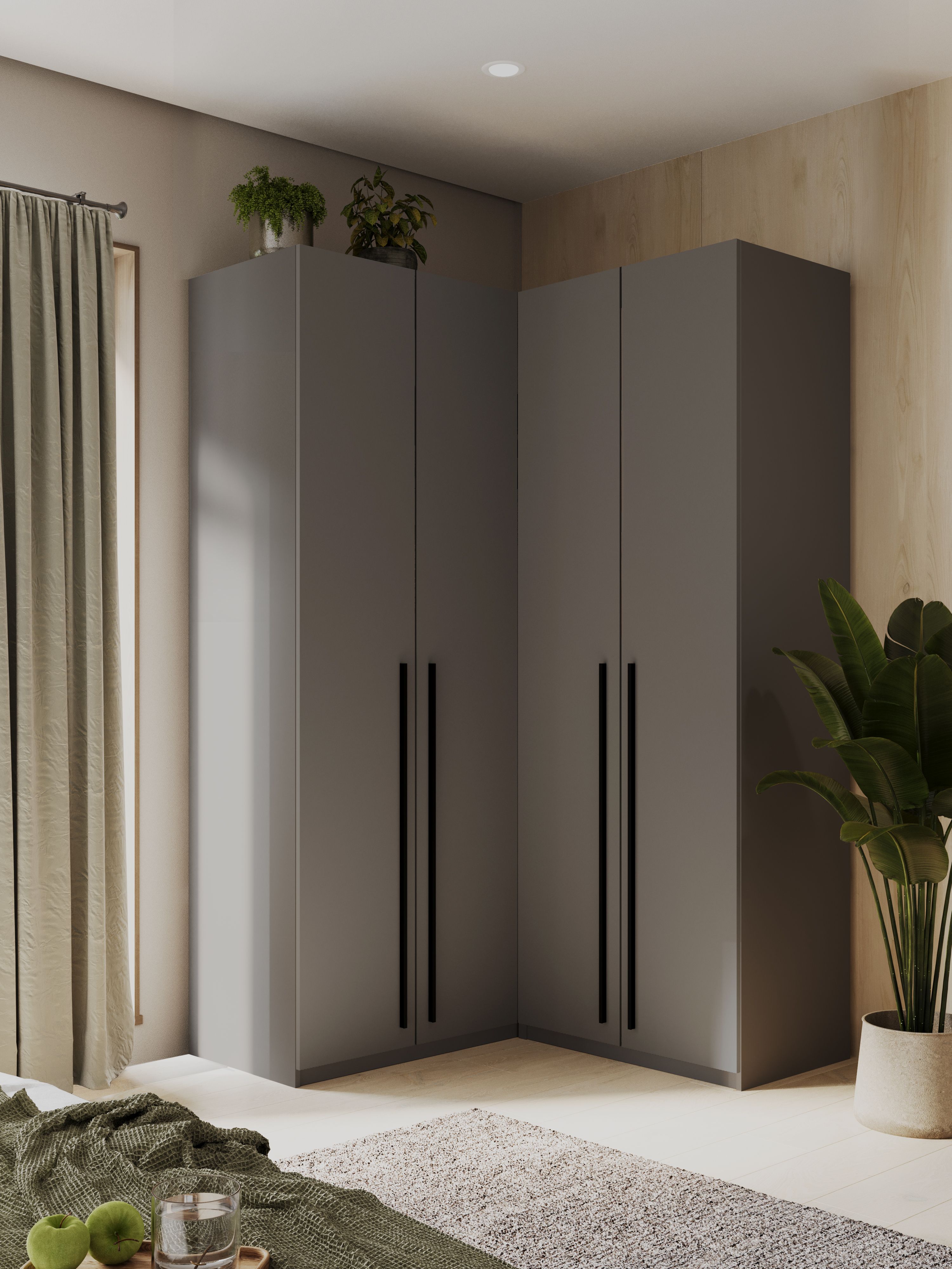 Угловой дизайн шкафа позволяет оптимально использовать пространство, особенно в небольших помещениях, и делать его более функциональным. Вы сможете легко разместить одежду, обувь и различные аксессуары, обеспечивая легкий доступ ко всему необходимому.