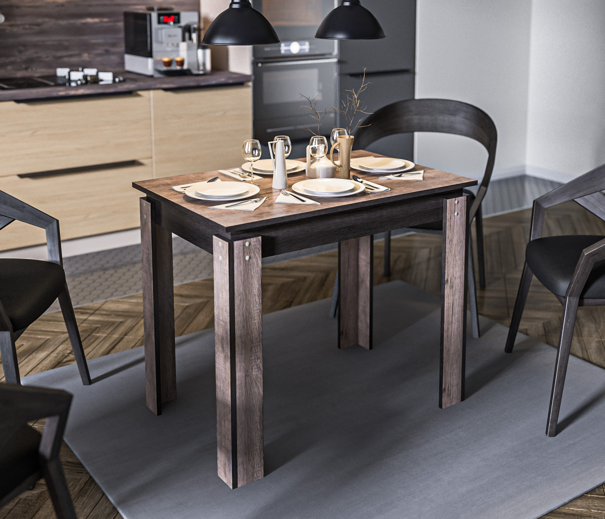Стол имеет прямоугольную форму и предназначен для использования на кухне и в столовой.