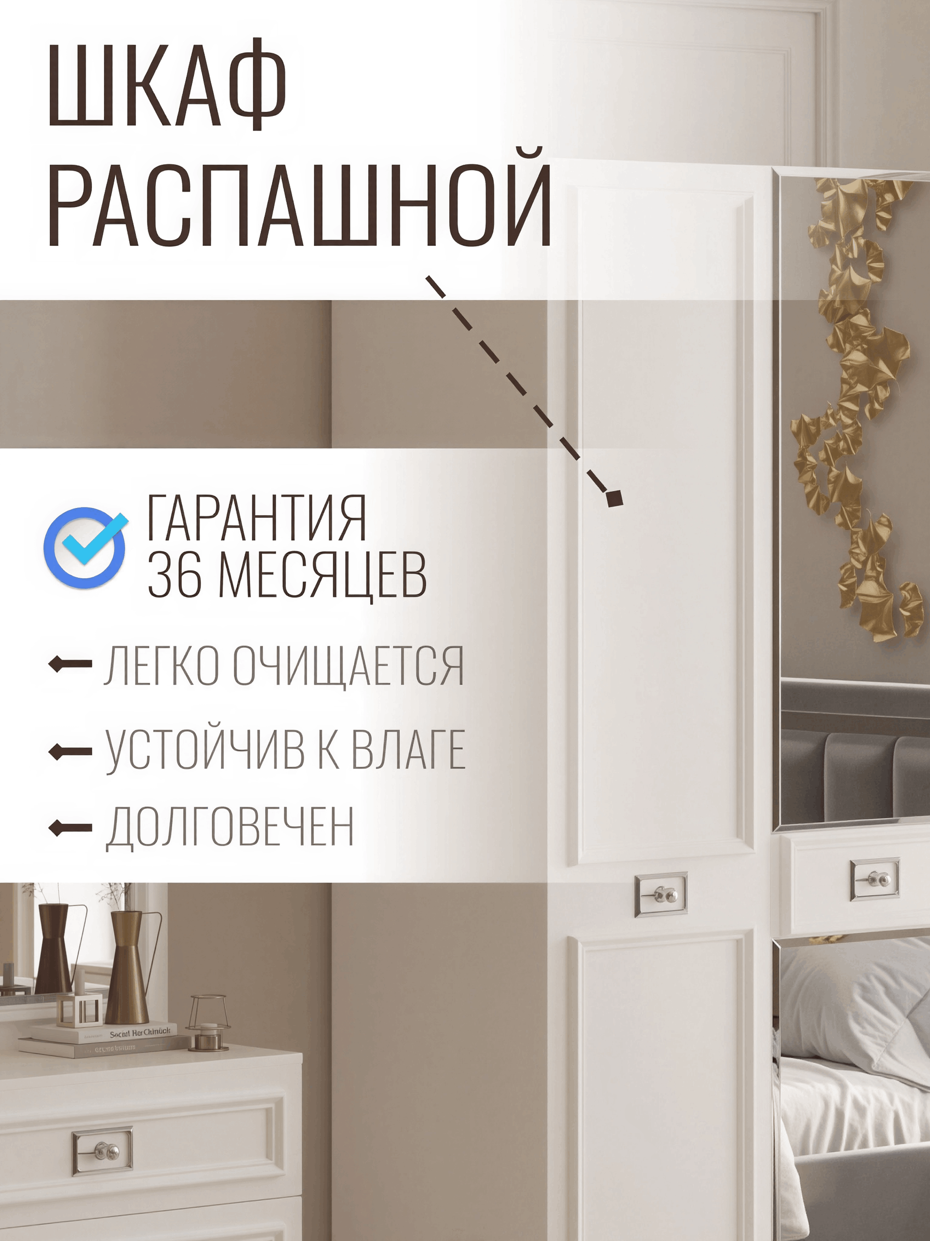 Представляем вам великолепный шкаф для спальни, который не просто мебель, а настоящее произведение искусства в стиле неоклассика. Этот шедевр не только обеспечивает вас максимальным пространством для хранения, но также станет эпицентром изыска и элегантности в вашей спальне.