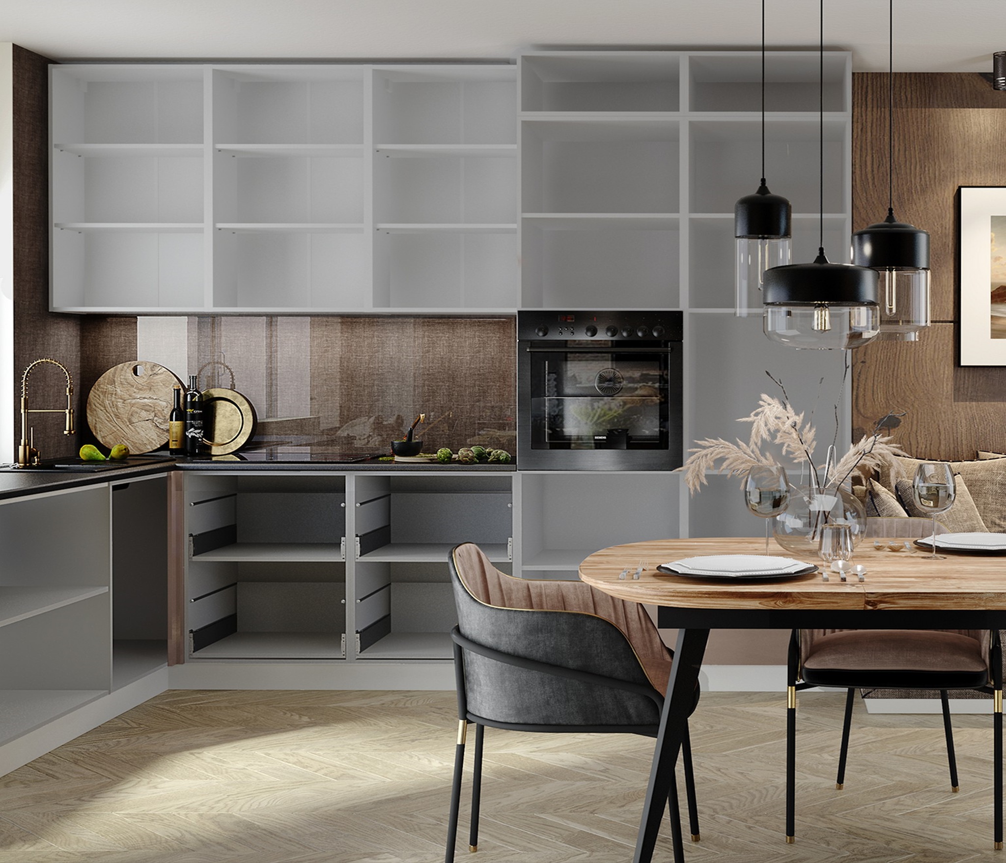 • Металлические ручки черного матового цвета стилистически дополняют контрастный дизайн и обеспечивают удобный захват. Матовое покрытие устойчиво к отпечаткам пальцев и сохраняет привлекательный вид при интенсивном использовании.