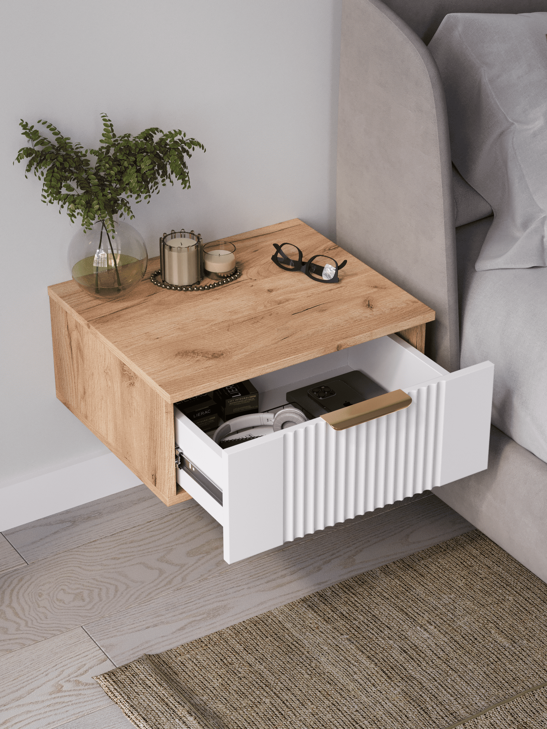 Подвесная прикроватная тумба с ящиком, соединяет в себе комфорт, функциональность и эстетику. Сегодня в тренде – стильные подвесные тумбы. Наша тумба подвесная российского производства выглядят легко и современно, идеально впишется в лофт, скандинавский, современный, минимализм и прочие популярные стили интерьеров. Ее минималистичный дизайн, невесомая конструкция и поразительная вместительность - придадут легкость и простор всему вашему интерьеру. Консоль подвесная размером 50х22х42 (ДхВхГ) см, сэкономит пространство и организует грамотное хранение вещей. Шкафчик навесной изготовлен из материалов высокого качества. За высокопрочность и долговечность отвечает корпус, выполненный из ЛДСП, подходит для активного использования. За эстетику и лаконичность дизайна отвечает фасад из МДФ созданный путем сложной фрезеровки в виде стильного 3D рисунка. Наша тумба прикроватная подвесная оснащена системой открывания push to open, которая подчеркивает монолитный образ. За удобство и комфорт открывания отвечают шариковые направляющие (без доводчиков). Ящик с такой системой открывания будет ходить практически бесшумно и выдвигаться полностью, даже при повышенной нагрузке (до 8 кг). Сборка этой узкой тумбы не требует особых навыков и не отнимет много времени. В комплекте для сборки настенного комода вы найдете все необходимые комплектующие и фурнитуру, что позволит вам легко и быстро собрать ее самостоятельно. Современная мебель должна не только брать на себя пару задач по организации пространства, но и гармонично смотреться. С этой задачей в интерьере справится шкаф с ящиком, который можно использовать в качестве прикроватной тумбы для хранения необходимых предметов рядом с кроватью в спальне. Тумбочка также может стать отличным туалетным столиком, где можно поместить любимую косметику и аксессуары для ухода за собой. Тумба прикроватная Ингрия-1 отлично прослужит как тумба в прихожую или в коридор, внутри нее можно хранить ключи или другие мелкие предметы. Благодаря возможности навесить тумбу на стену на нужной высоте, появится возможность оптимально использовать пространство комнаты. Это особенно актуально для небольших помещений, где каждый квадратный метр имеет значение. Особенно полезной полка с выдвижным ящиком будет в офисных помещениях, так как эта офисная тумба придаст лаконичности и удобства любому помещению. Тумба навесная Ингрия найдет применение и в салонах красоты и в детских комнатах. Почувствуйте себя дизайнером создайте уют с помощью нашей многофункциональной ниши для хранения.