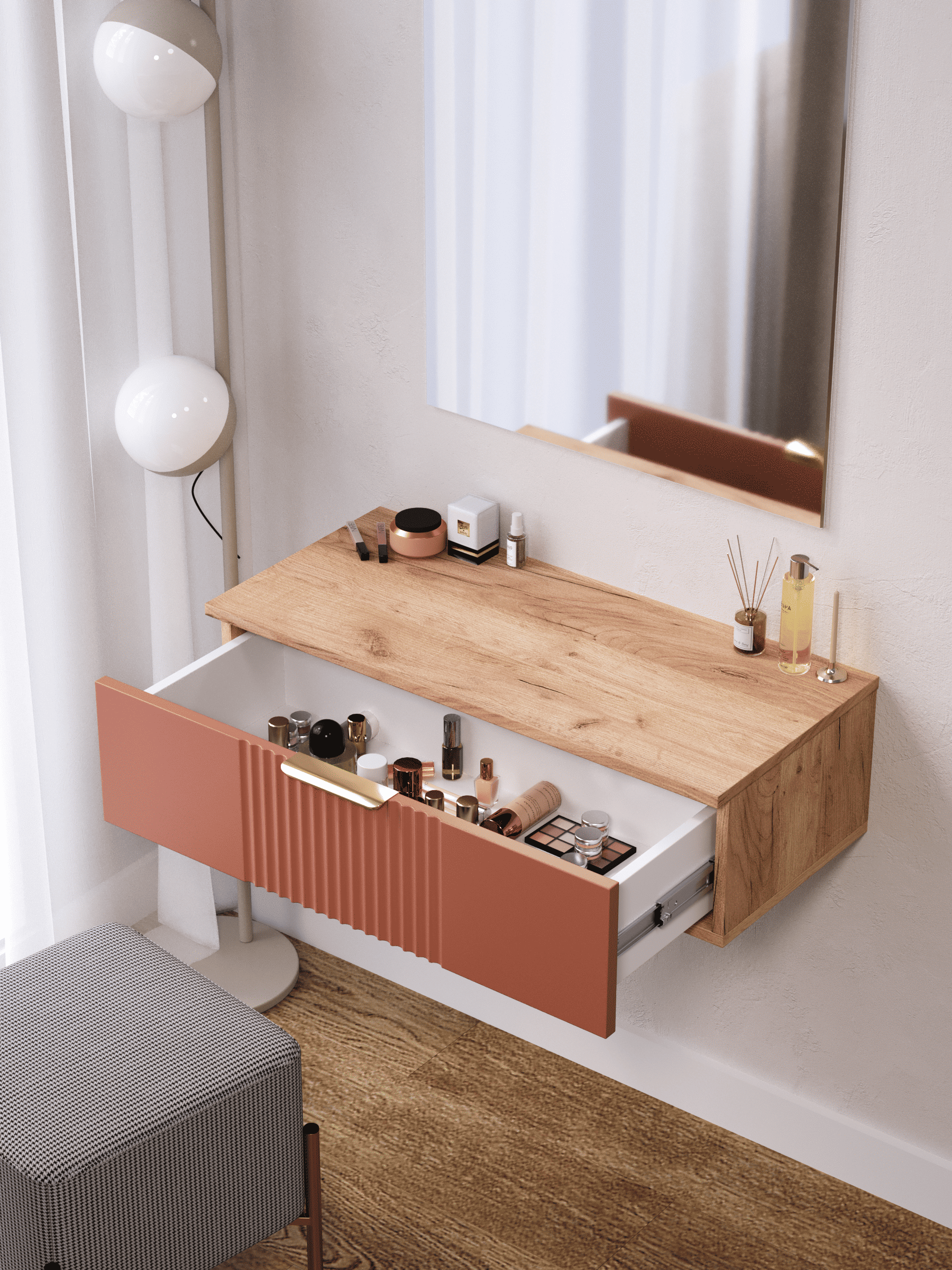 Стильный и практичный Туалетный столик Ингрия Luxe с ящиками, решит как минимум две ваших задачи, будет служить многофункциональной нишей для хранения вещей, и универсальной подставкой для различных предметов интерьера. Наша модель Ингрия Luxe российского производства выглядят легко и современно, идеально впишется в лофт, скандинавский, современный, минимализм и прочие популярные стили интерьеров. Его минималистичный дизайн придадут легкость и простор всему вашему интерьеру. Компактный туалентный столик сэкономит пространство и организует грамотное хранение вещей. Имеет выдвижной ящик. За удобство и комфорт открывания ящика отвечают шариковые направляющие (без доводчиков), с полным выдвижением и системой открывания Push-to-Open . Ящики с такой системой открывания будут ходить практически бесшумно, и выдвигаться полностью, даже при повышенной нагрузке. За высокопрочность и долговечность отвечает корпус, выполненный из ЛДСП, подходит для активного использования. За эстетику и лаконичность дизайна отвечает фасад из МДФ созданный путем сложной фрезеровки в виде 3D рисунка.