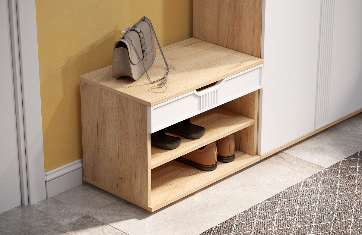 Тумба для обуви Эмилия ЭЛ-44 – компактная модель для комфортного переобувания в прихожую. Лаконичное изделие оборудовано двумя полками для обуви и сиденьем, под которым находится удобный ящик для хранения чистящих средств, щеток или зонта. Высота опоры 20 мм.