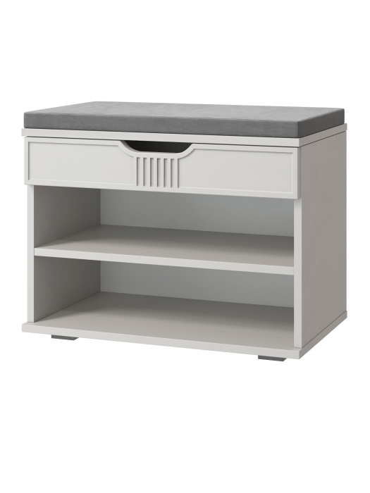 Тумба для обуви Эмилия ЭЛ-44К – компактная модель для комфортного переобувания в прихожую. Лаконичное изделие оборудовано двумя полками для обуви и мягким сиденьем, под которым находится удобный ящик для хранения чистящих средств, щеток или зонта. Ткань мягкой части велюр, наполнение: поролон 40 мм, синтепон, белый флизелин. Высота опоры 20 мм.