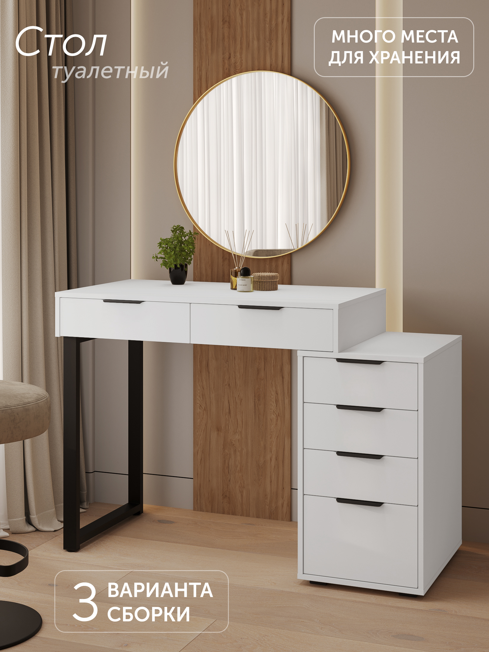 Универсальность: подходит для использования в качестве письменного, компьютерного или маникюрного стола. Рекомендуется высокий стул. Фурнитура: телескопические направляющие полного выдвижения без доводчиков, металлические ручки и опора.