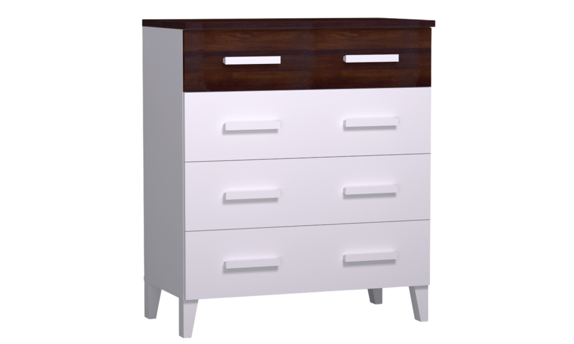 Комод Норвуд идеально подходит для хранения постельного белья и одежды для сна, а если его дополнить Норвуд 7 Зеркало навесное – он сможет одновременно выполнять функции туалетного столика. Столешница толщиной 22 мм и фасад верхнего ящика в декоре Орех Шоколадный контрастируют с белым декором модуля. Четыре выдвижных ящика на направляющих полного выдвижения глубиной 350 мм открываются/закрываются легко и плавно. Ножки со скосом значительно облегчат процесс уборки в спальне.