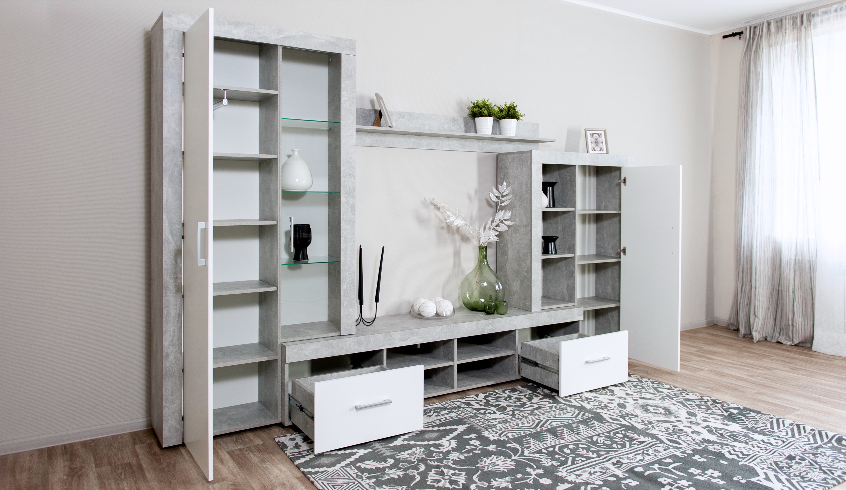 Стенка Джерси – светлая, компактная и функциональная. Беспроигрышный вариант для небольших комнат. В модели используются утолщенные линии корпуса, вместительные ящики полного выдвижения, регулируемые ножки. Благодаря модным и стильным цветовым решениям, гостиная подойдет под любой интерьер, создаст дома теплую уютную атмосферу.