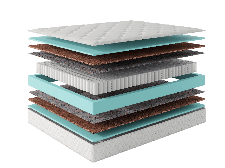Чехол из трикотажа, стеганого на объемном волокне 200 гр/м2. Пена, 10мм. Кокос, 10мм. Термовойлок. Независимый пружинный блок, 140мм. Термовойлок. Кокос, 10мм. Пена 10мм. Усиление по периметру матраса 100 мм. Высота: 21см. Средняя жесткость.