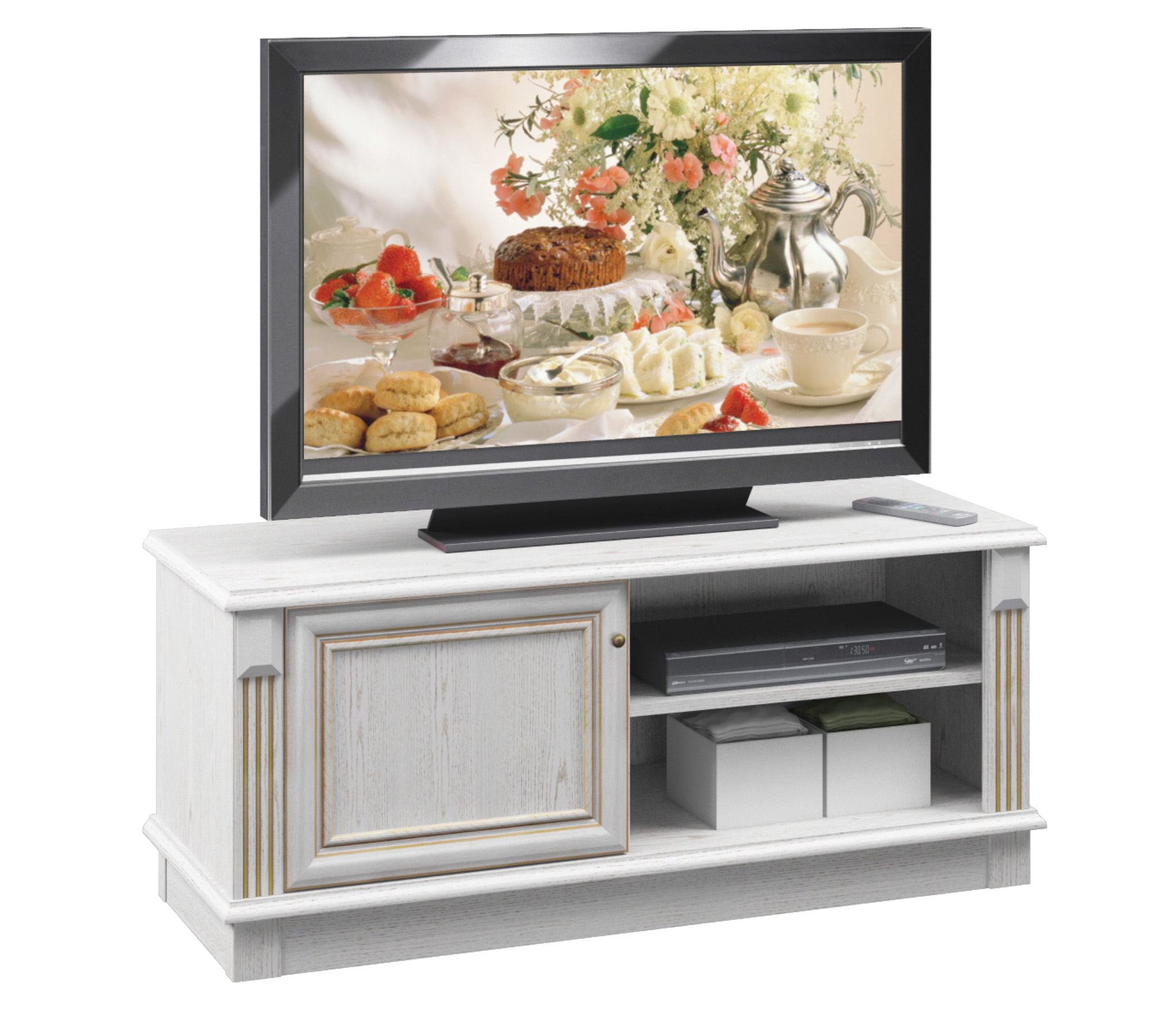 Габаритные размеры – ширина 120 см, высота 53 см и глубина 44 см. Вес тумбы 36,85 кг, что даёт возможность передвигать её по усмотрению. Под столешницей расположены две открытых полки и отделение с отдельной дверцей. Тумба выполнена в классическом дизайне из прочного современного КДСП в цвете «Белый Ясень», рамочный фасад выполнен из МДФ.