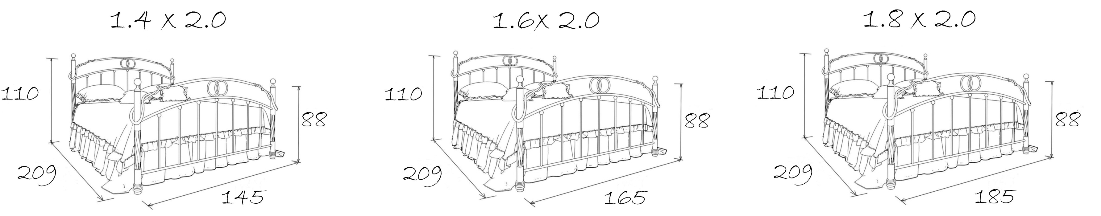 Размеры спального места (ДхШ) 2000х1400, высота изножья 880 мм, максимальная нагрузка на 1 спальное место - 150 кг.