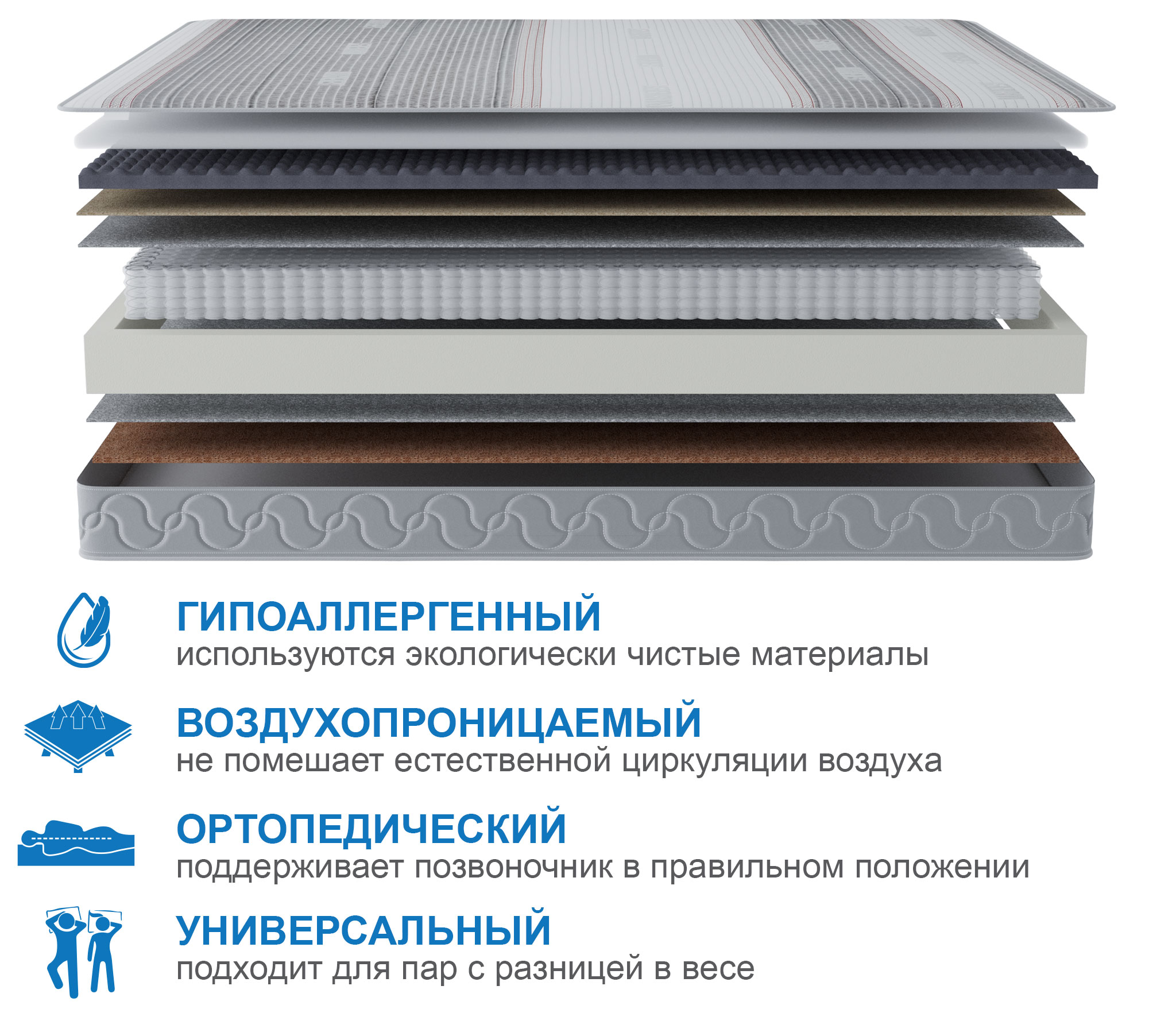 Матрас обладает разной жесткостью сторон. Вязкоаэластичная пена с эффектом микромассажа- уникальный материал, аналогичный материалам с памятью форм, но при этом создает более приятные ощущения за счет ячеек. Способствует улучшению кровообращения и предотвращает защемление мягких тканей. Один из самых востребованных материалов класса люкс. Обеспечивает циркуляцию воздуха внутри матраса, гипоаллергенен и устойчив к износу. Под ним находится слой латексированного сизаля, который отвечает за необходимую жесткость и распределение нагрузки на блок пружин, этот материал очень гибок и долговечен. Блок независимых пружин оказывает давление и поддержку только там где это необходимо, создавая при этом все условия для правильного расположения позвоночника во время сна. Обратная сторона матраса более жесткая, т.к. там используется латексированный кокосовый мат толщиной 2 см, но при этом для людей с весом ниже среднего матрас не будет казаться слишком жестким потому, что его чехол стегается на 15 мм пене с синтепоном плотностью 500 гр/м2. Обращаем ваше внимание на то, что любой матрас отвечает за правильность положения во время сна нижнего и среднего отделов позвоночника, а за правильность положения шейного отдела отвечает правильно подобранная ортопедическая подушка. Рекомендуем использование с защитным чехлом AquaStop.