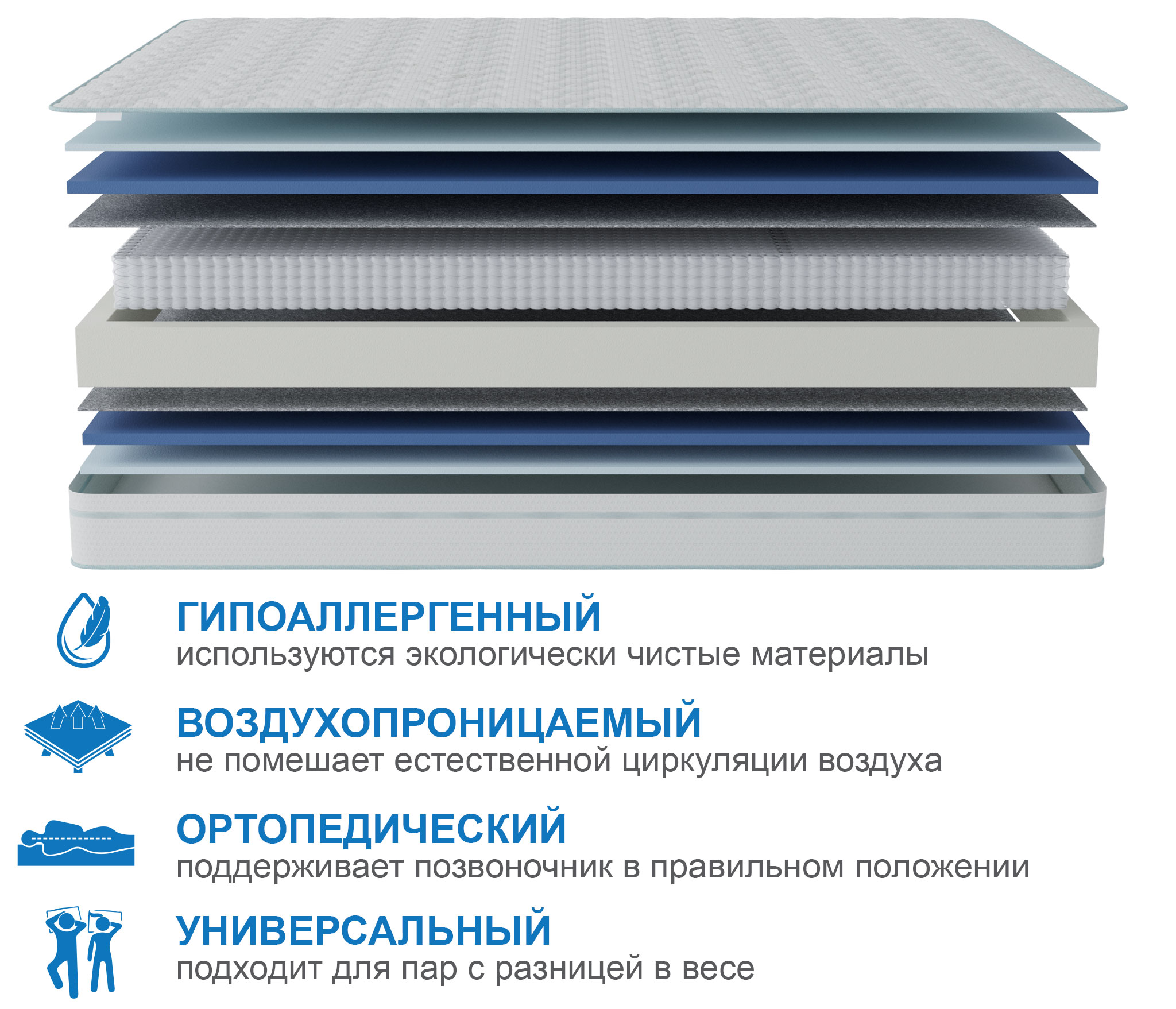 Этот матрас гарантирует оптимальную температуру для сна, на нем не будет холодно или жарко. Термогель, который входит в состав нити из которой делается одна из сторон матраса, гарантирует, что температура матраса будет ниже на 2 градуса цельсия, чем температура тела. Что опять же пойдет на пользу парам, которые не могут договориться о толщине одеяла или о том будет ли открыто окно на ночь. Для каждого температура будет оптимальной. Данное свойство не имеет срока годности и сохранится, даже в случае повреждения самой ткани матраса.В основе матраса лежит блок независимых пружин (мультипакет) 500 пр/м2, благодаря такой плотности пружин, матрас может повторять контуры спящего с максимальной точностью и при этом выдерживать довольно высокие нагрузки. Термовойлок защищает комфортные слои от истирания и соприкосновения с пружинами. В качестве комфортного слоя используется самая жесткая и прочная пена из существующих - (HL4065) толщиной 3 см.
