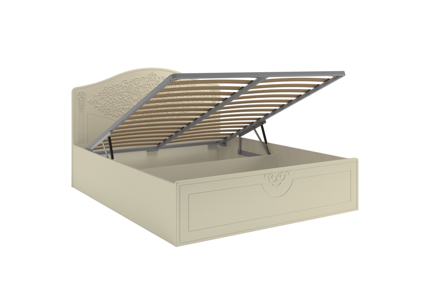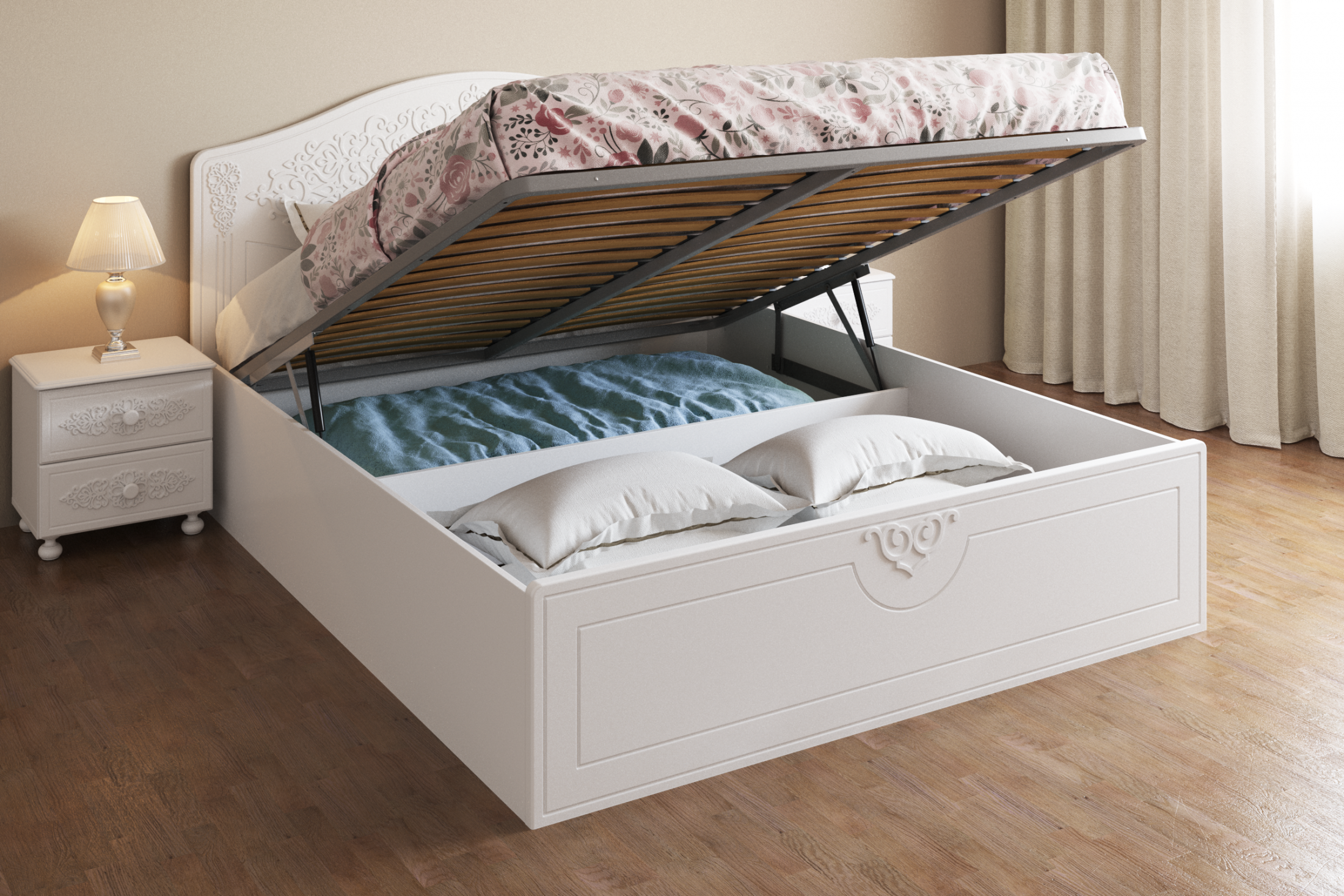Кровать оснащена подъемным механизмом, обеспечивающим доступ в короб для хранения постельного белья.С двуспальной кроватью идеально подходит банкетка АС-34 для размещения рядом (в ногах).
