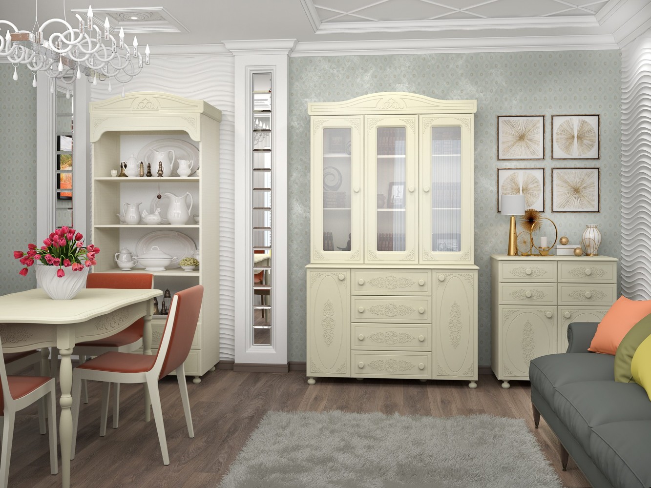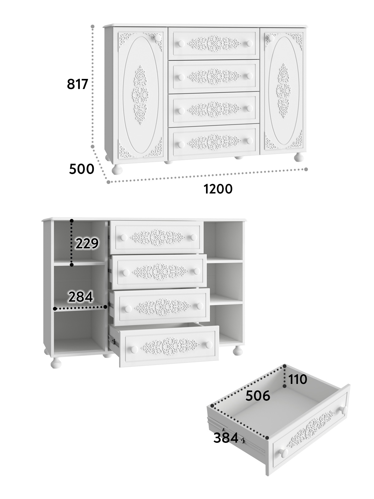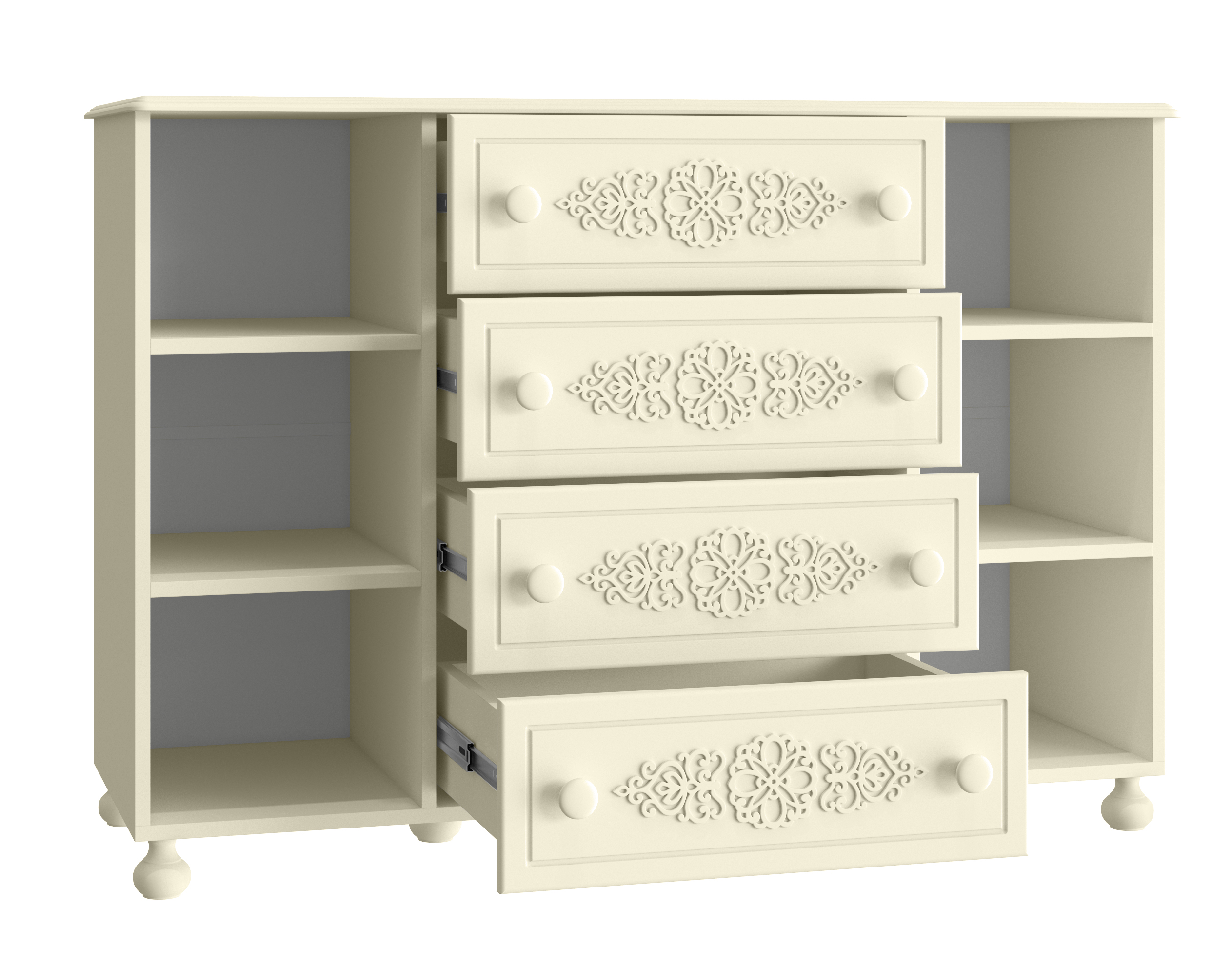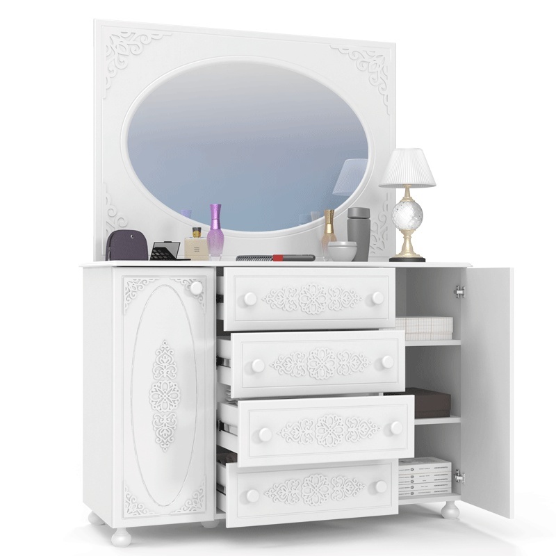 «Ассоль» - мягкий мерцающий глянец и эксклюзивный узор, повторяющийся на фасадах всех модулей идеален для создания нежного уютного интерьера спальни, гостиной, детской, прихожей.Комбинированная тумба с двумя вертикальными закрытыми сегментами и четырьмя выдвижными ящиками.
