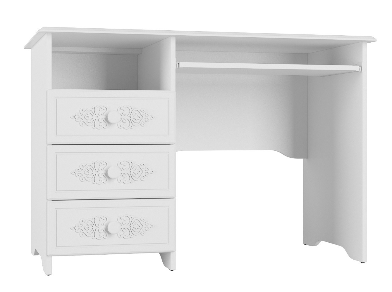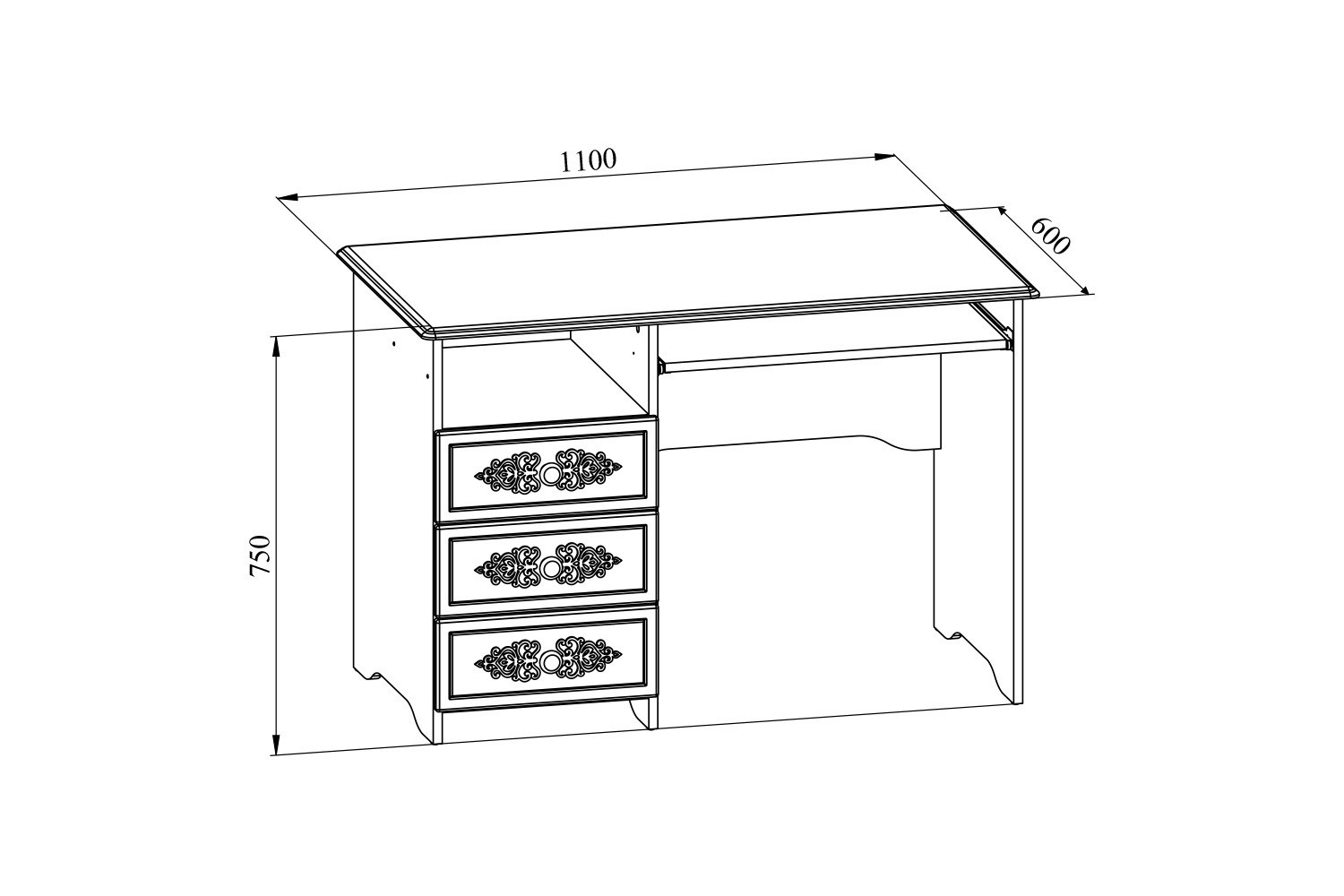 Письменный стол с тремя ящиками. Размер столешницы 1100 мм * 600 мм. Может использоваться, как стол для компьютера. Снабжен выдвигающейся панелью 300 мм * 600 мм для клавиатуры.