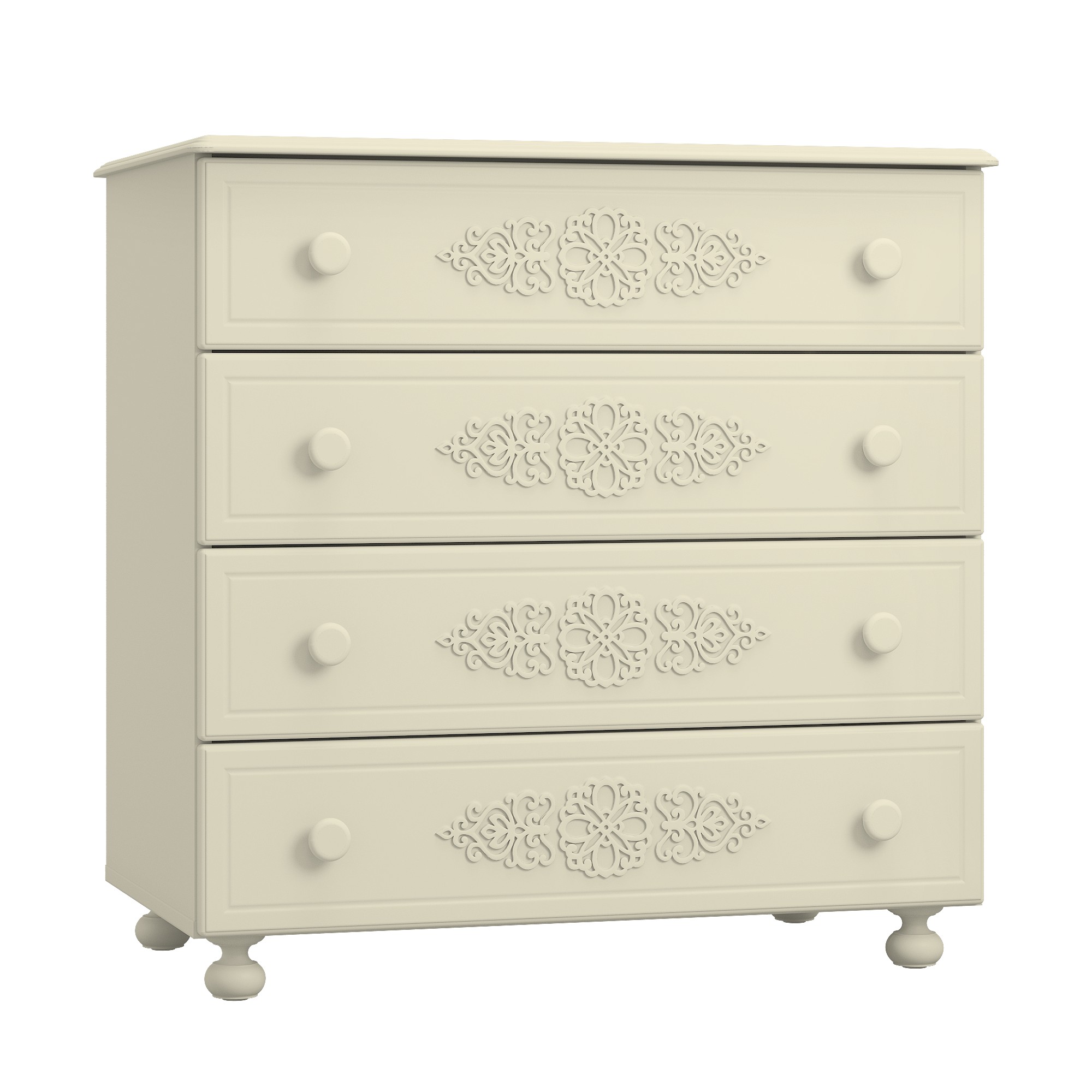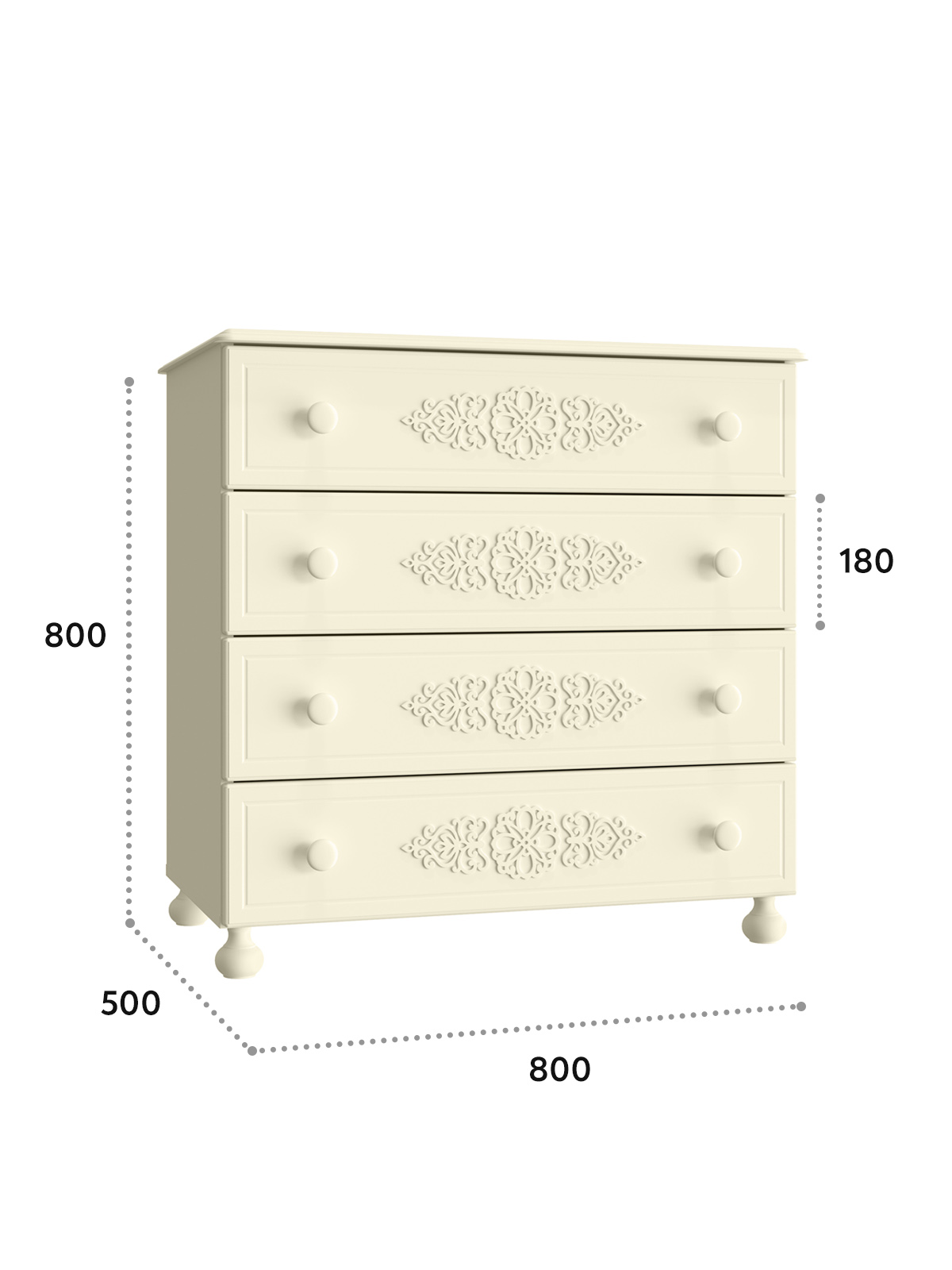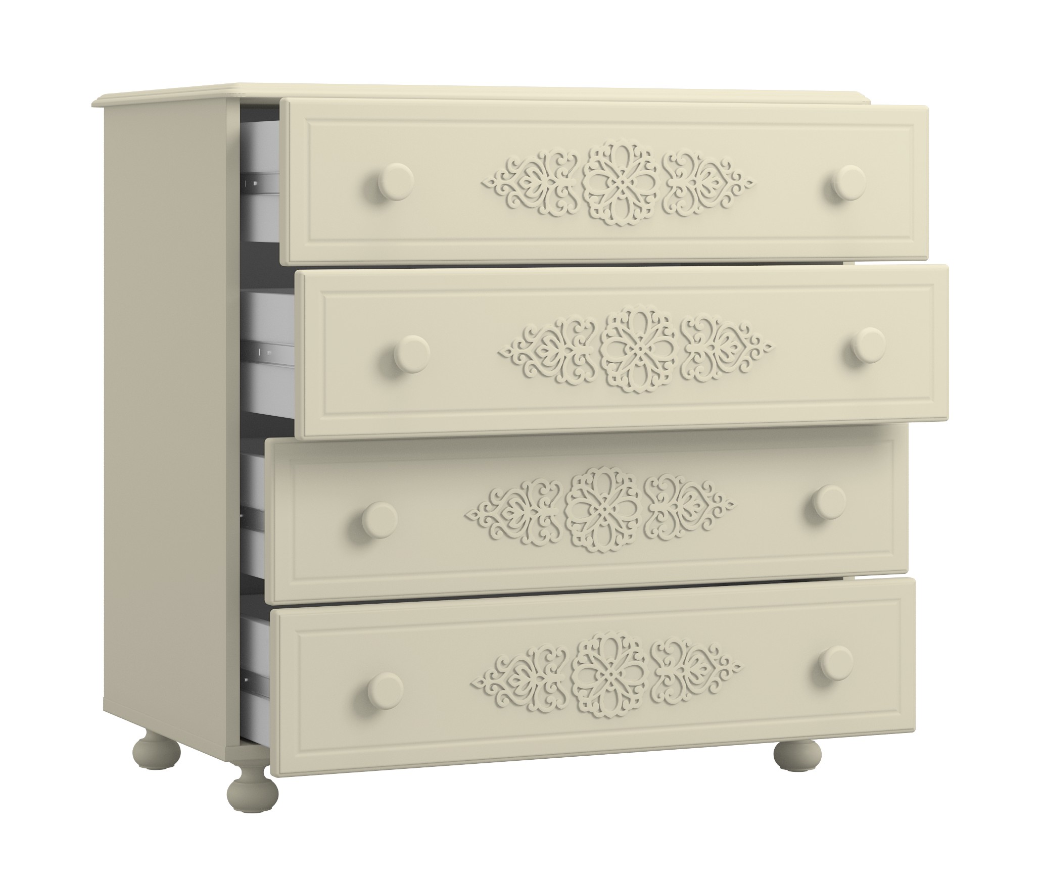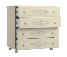 Комод имеет четыре выдвижных ящика. Высота боковых стенок каждого ящика 130 мм, ширина ящика 690 мм, глубина 400 мм. Ящики установлены на телескопических направляющих полного выдвижения.