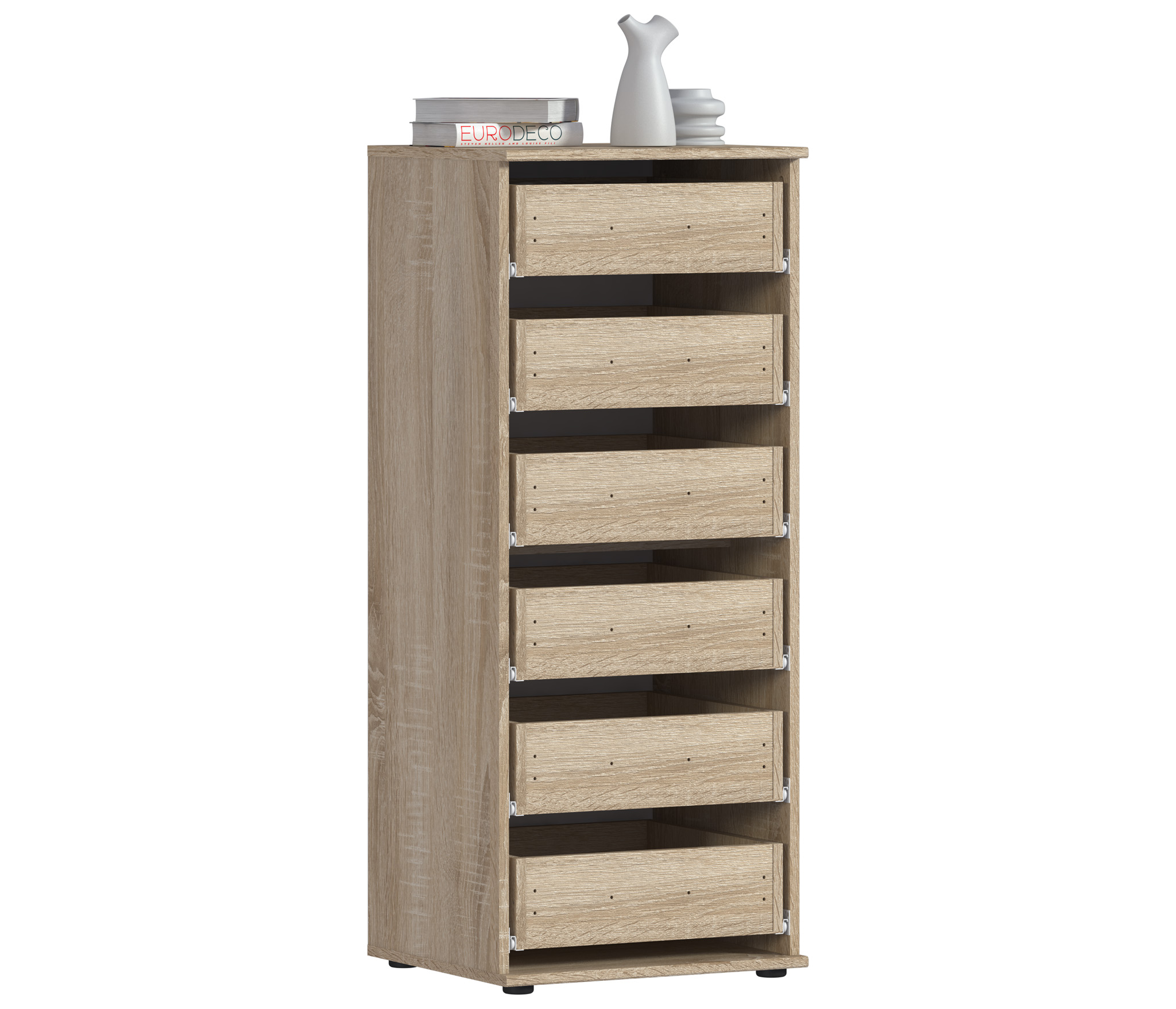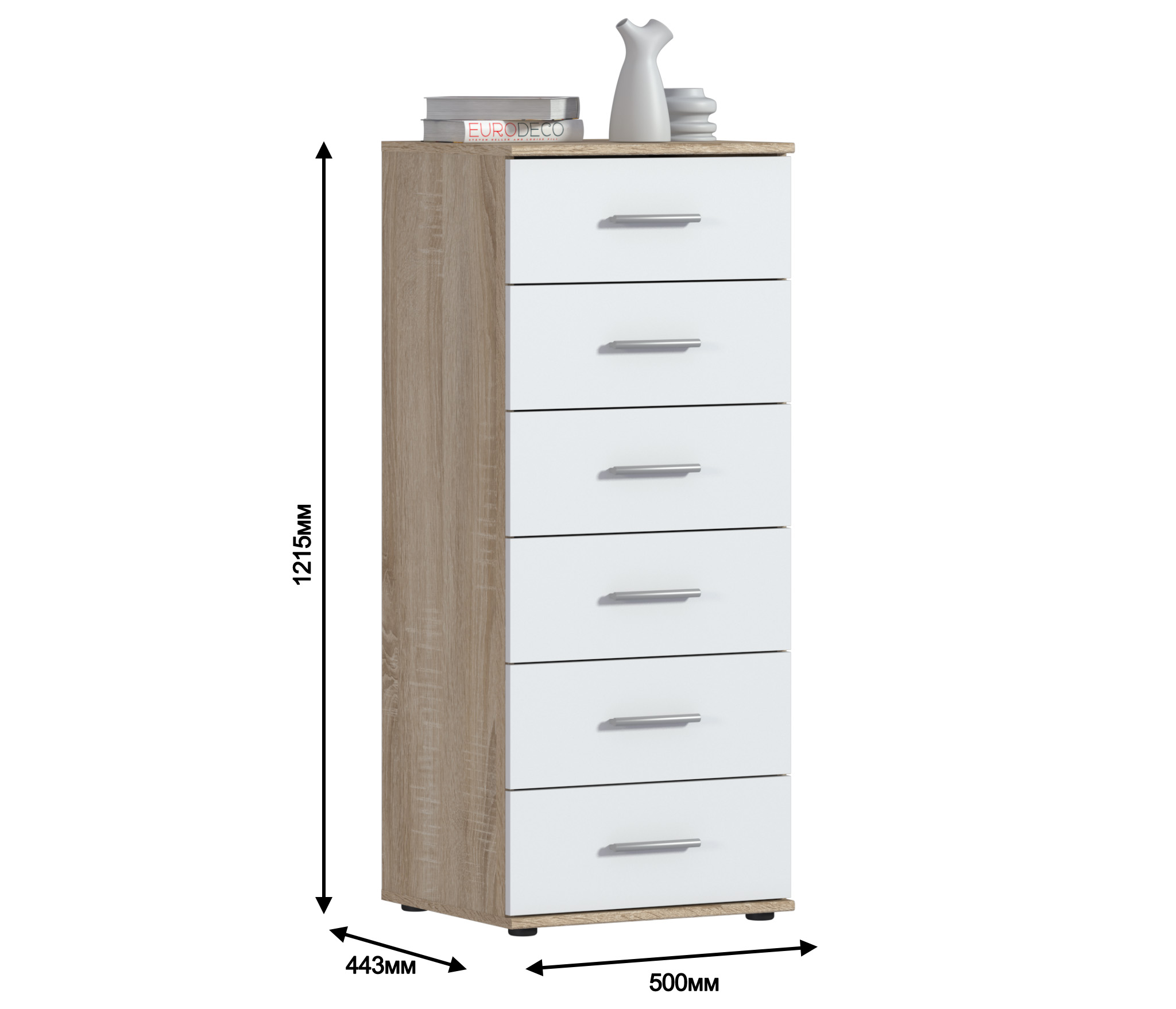 Комод Мамбо имеет довольно компактные габариты -- ширина 50 см, высота 121 см и глубина 44 см. Однако его обладатели никогда не жаловались на вместительность. В шести выдвижных ящиках можно разместить множество нужных вещей.