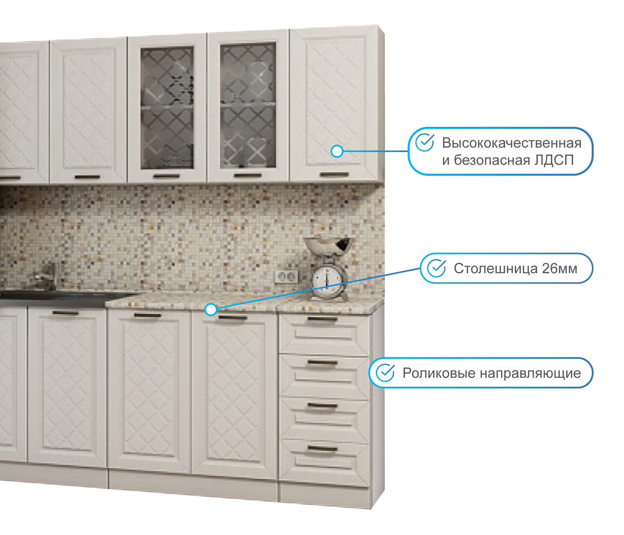 Кухню покупали в загородный дом, по этому рассматривали не дорогой вариант . Выбрали цвет фасада белый, столешница в этом цвете отлично под ламинат на полу . Отличное сочетание, кухня выглядит дорого и современно. За такие деньги и не думала что можно сделать хорошую кухню. Благодарны вам, будем рекомендовать ваш магазин.