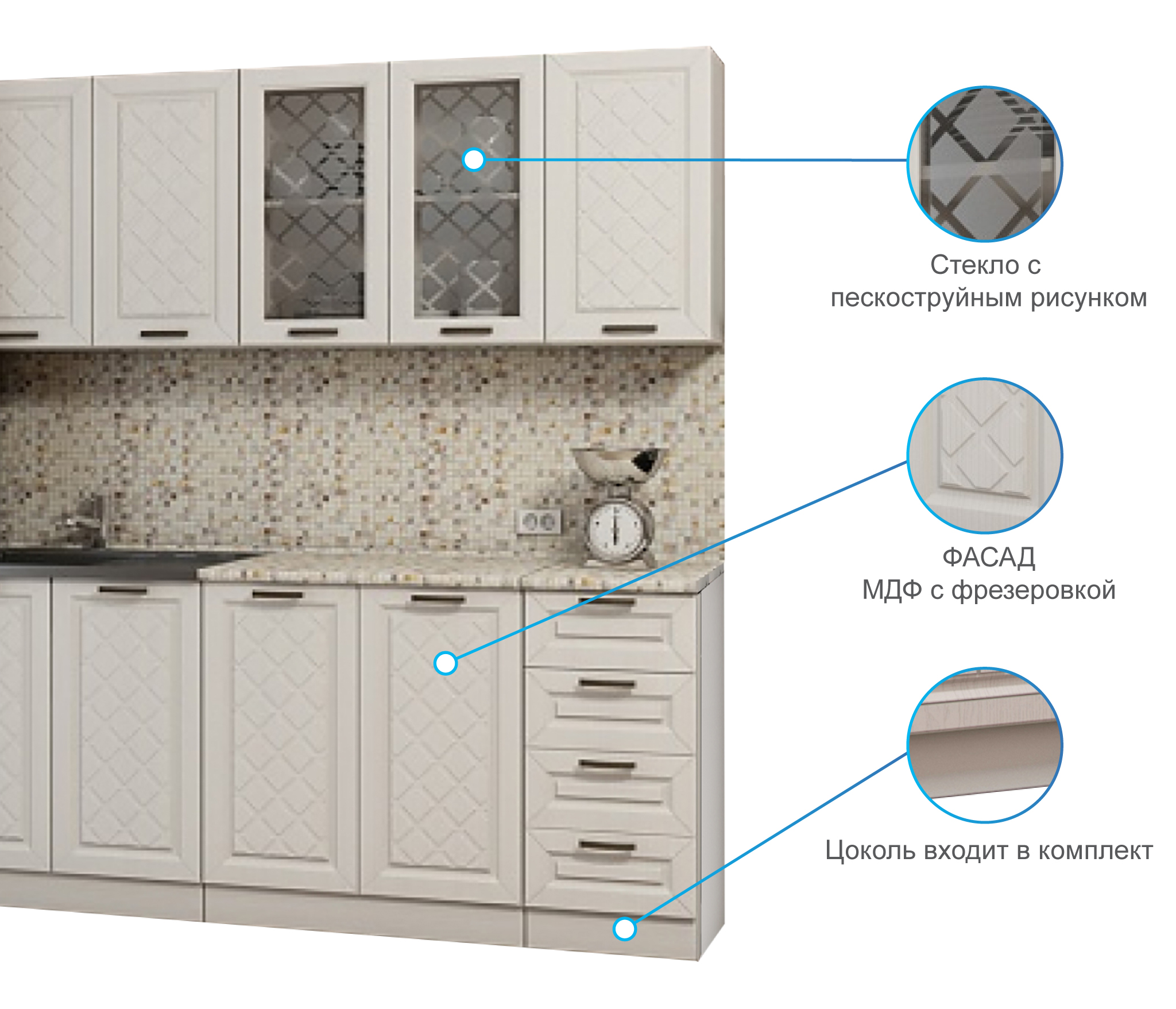 Кухня Агава- изящный гарнитур с фрезеровкой по фасаду и матовыми стёклами.