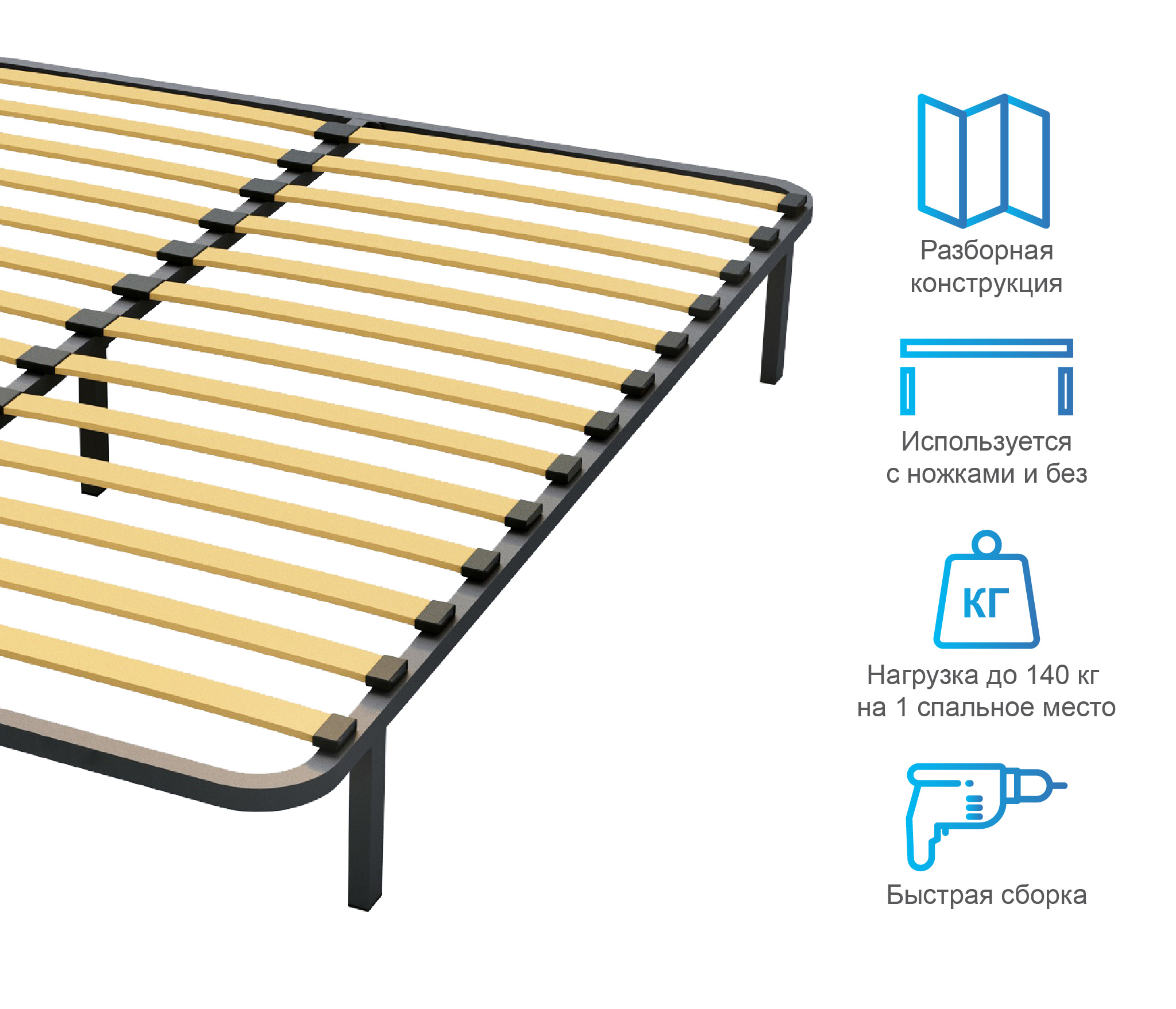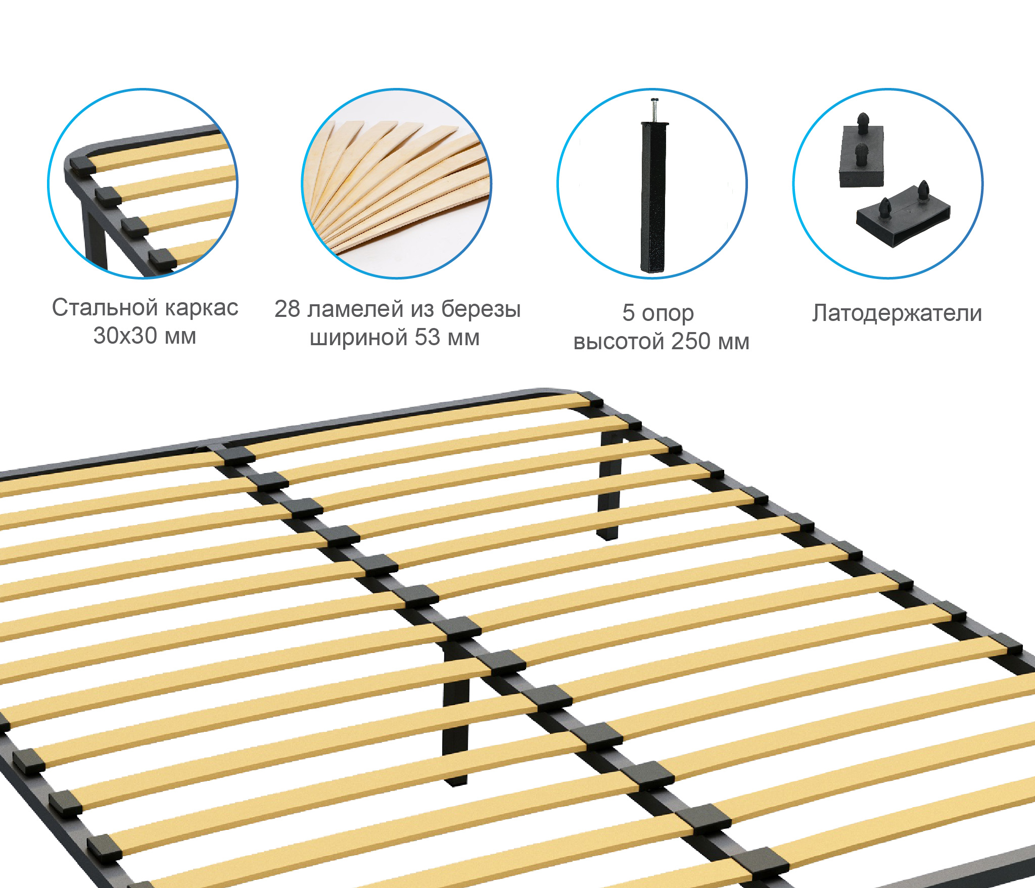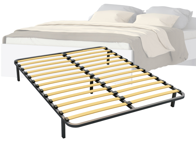 Разборное кроватное основание выполнено из металлической трубы квадратного сечения (30х30мм) и упругих гнуто-клееных берёзовых ламелей шириной 53 мм, толщиной 8 мм.