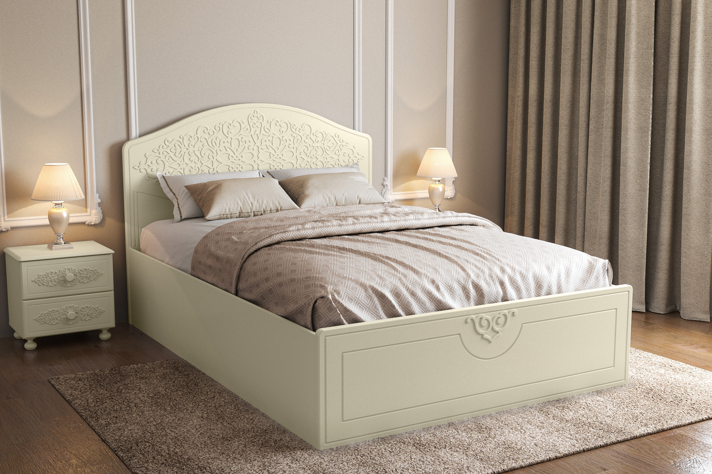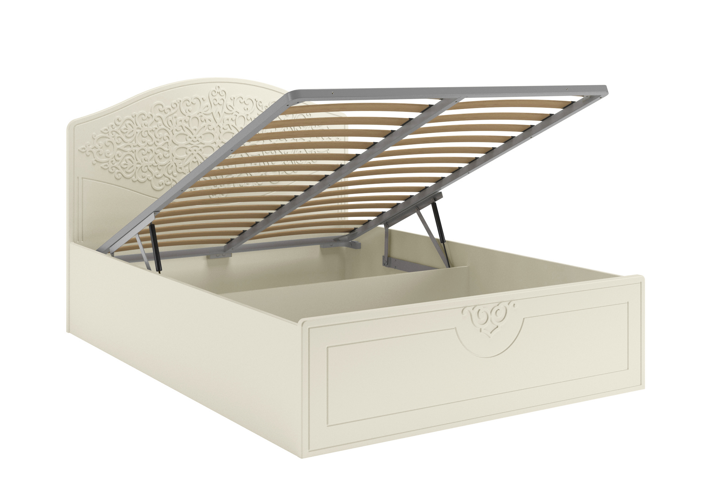 Материал корпуса/фасада: ЛДСП/МДФ. Цвет корпуса/фасада: ваниль/ваниль. Размеры модуля (д/ш/в) в мм: 2070х1479х1134. Высота изножья 420 мм. Основание кровати: ламели с подъемным механизмом. Особенности: короб для хранения постельного белья. Рекомендуемый размер матраса в мм: 1400х2000х200-230.