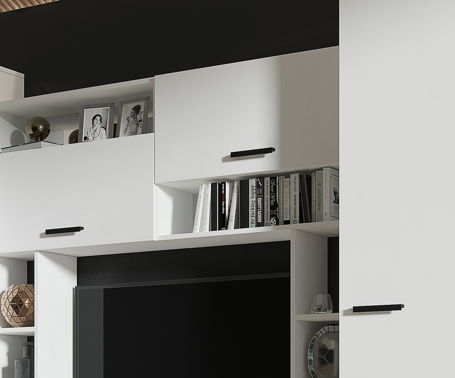 Средняя секция с нишей под ТВ размером 1000х800 мм с двумя выдвижными ящиками на роликовых направляющих и полочками.