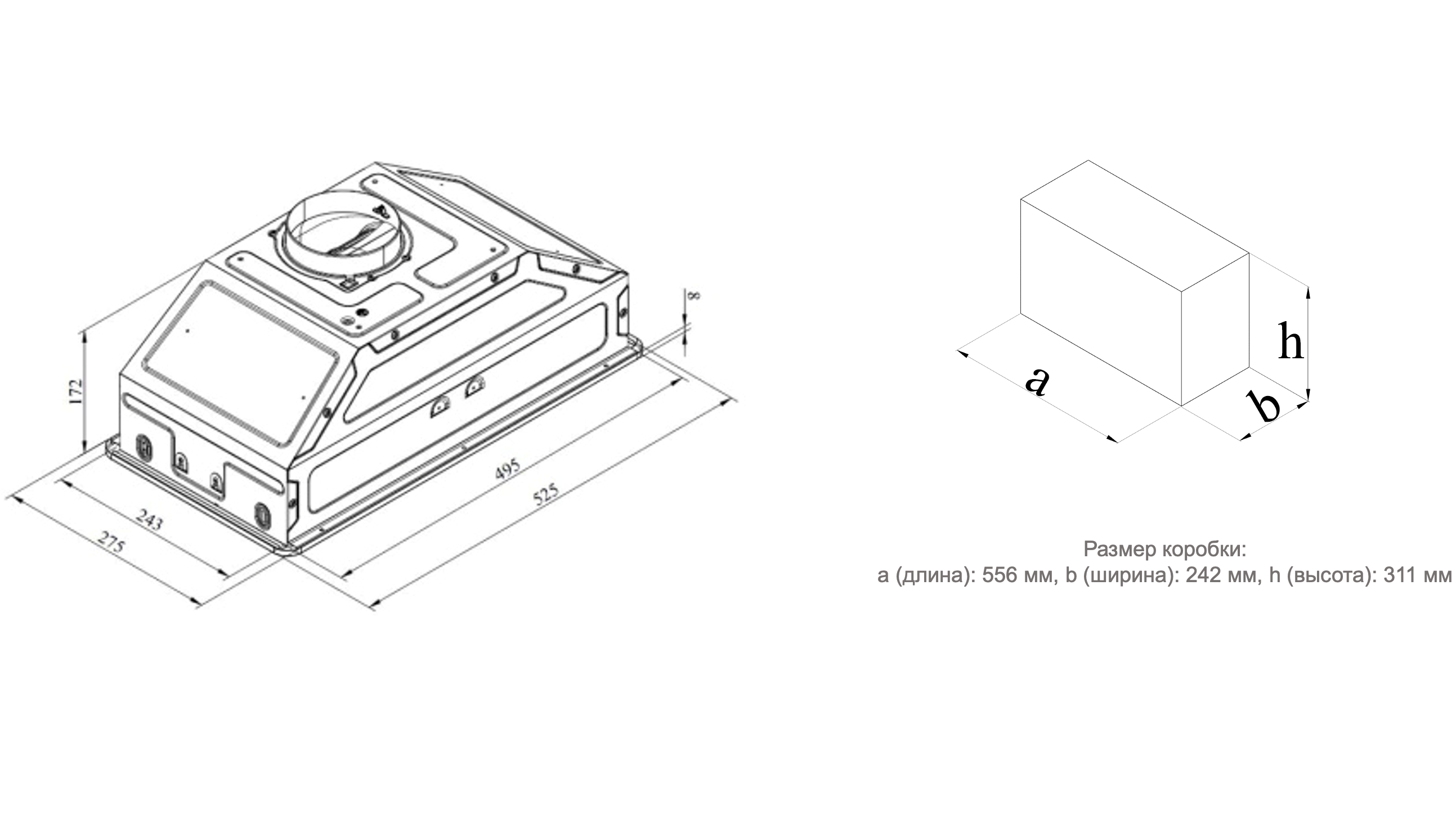 Размер (ВхШхГ) мм:180х525х275