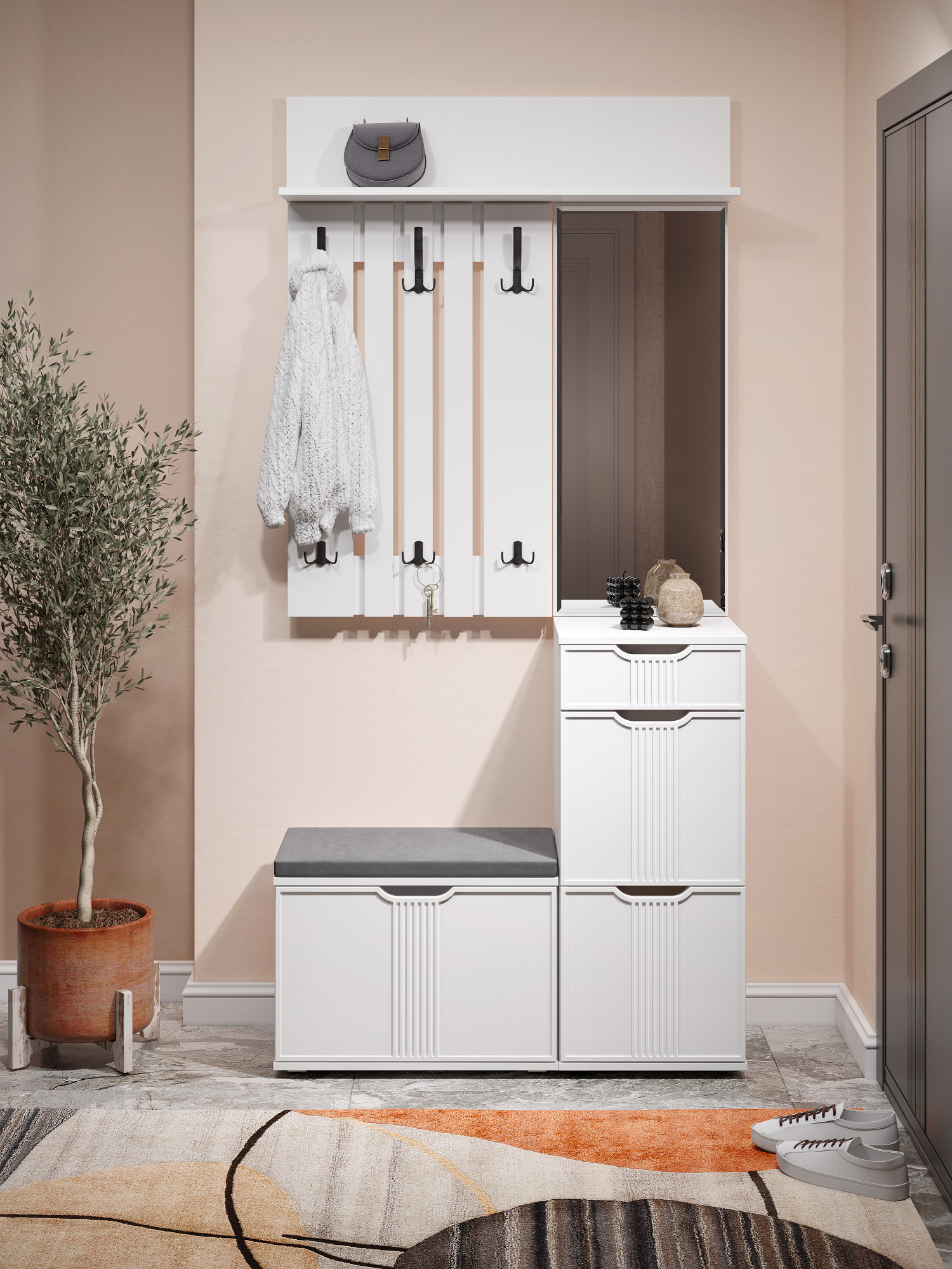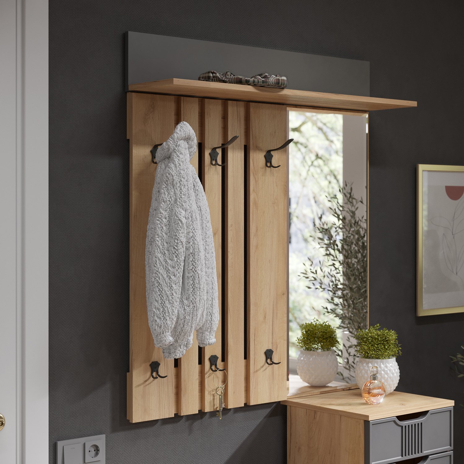 Вешалка Эмилия ЭЛ-6 компактна и функциональна, поэтому органично дополнит любой интерьер вашей прихожей. Вешалка состоит из нескольких объединенных панелей лдсп, трех двойных и трех тройных крючков, благодаря чему на ней можно с легкостью разместить верхнюю одежду нескольких человек. Крючки металлические, максимальная допустимая нагрузка до 15 кг на один крючок. Сочетая вешалку с другими модулями из коллекции Эмилия, Вы можете создать стильную и лаконичную прихожую у себя дома.