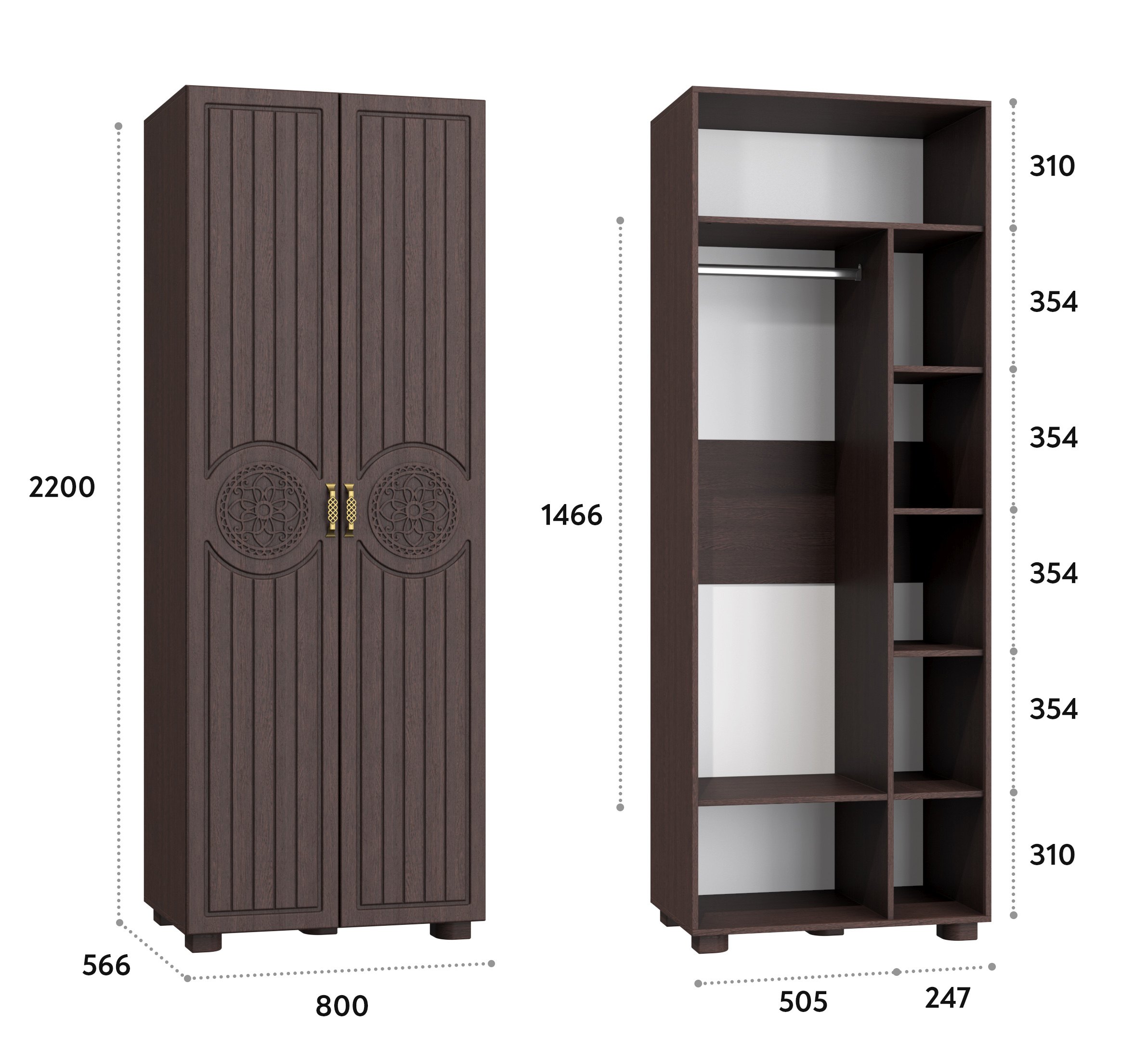 Шкаф двухдверный Монблан МБ-26К станет замечательным дополнением для обустройства комфортной и функциональной комнаты. За распашными дверьми находится штанга для вешалок-плечиков. Полки предназначены для хранения сложенной одежды, белья, различных аксессуаров и коробок с обувью. Двери шкафа могут комплектоваться зеркалами. Высота опоры 50 мм.