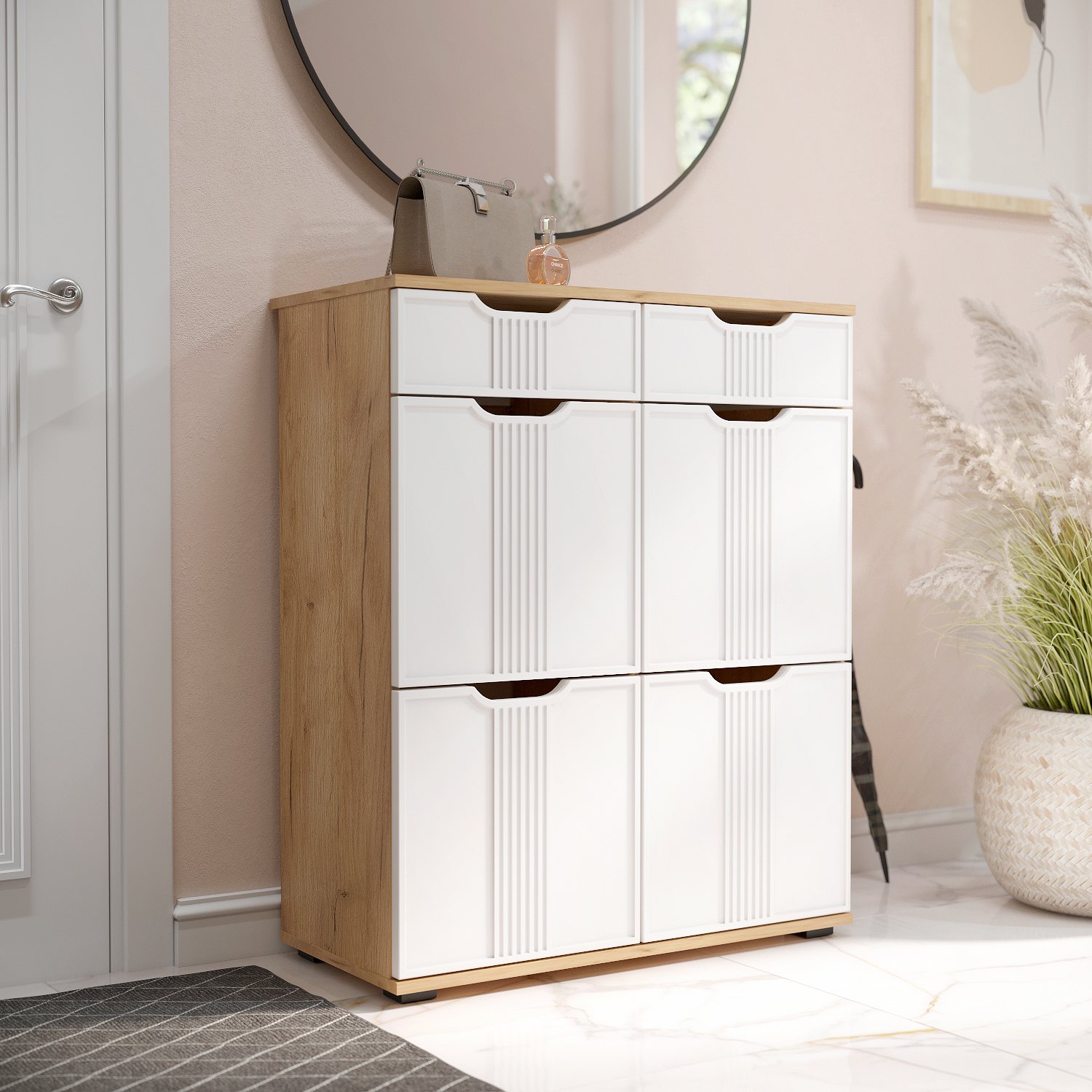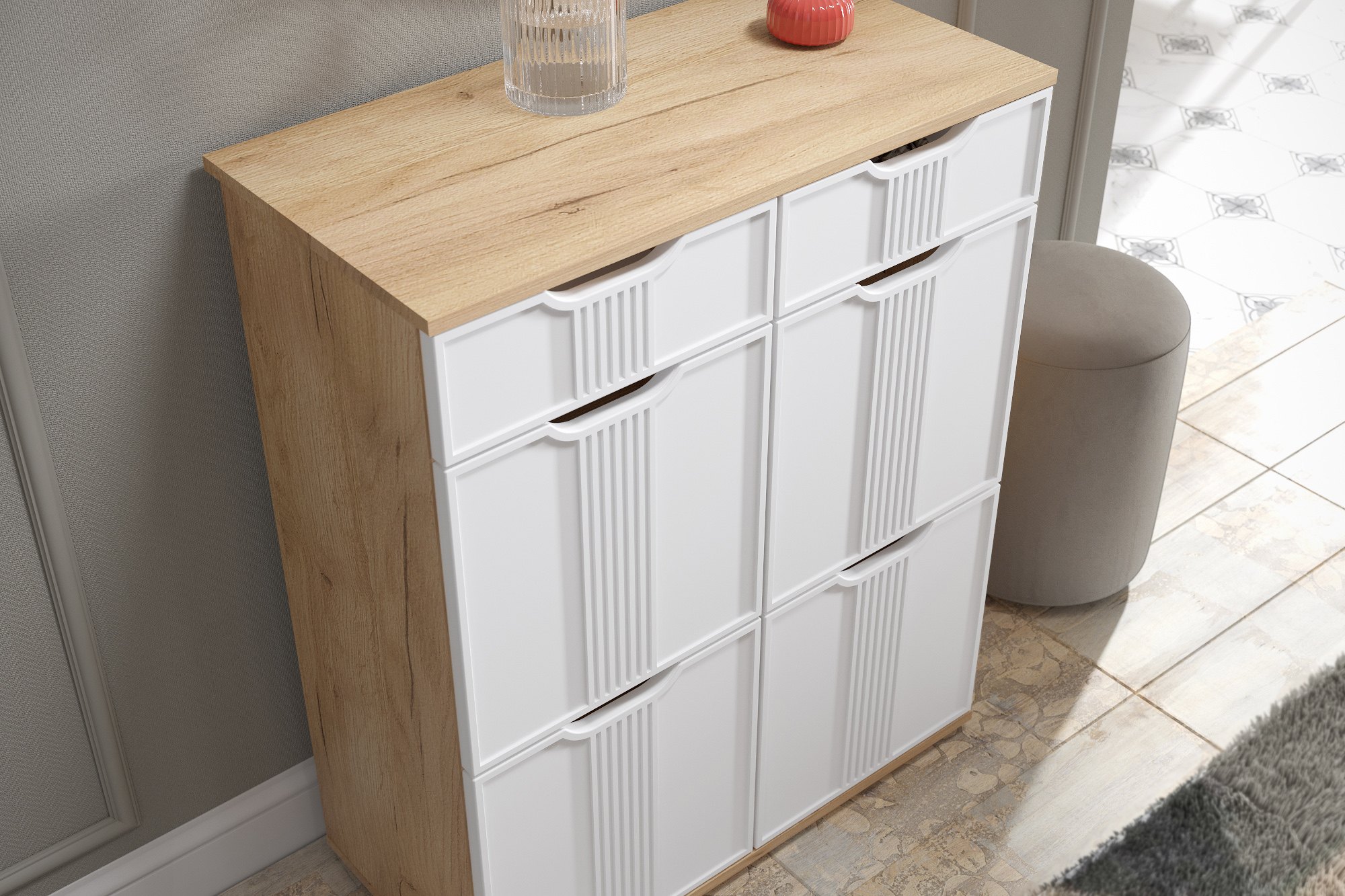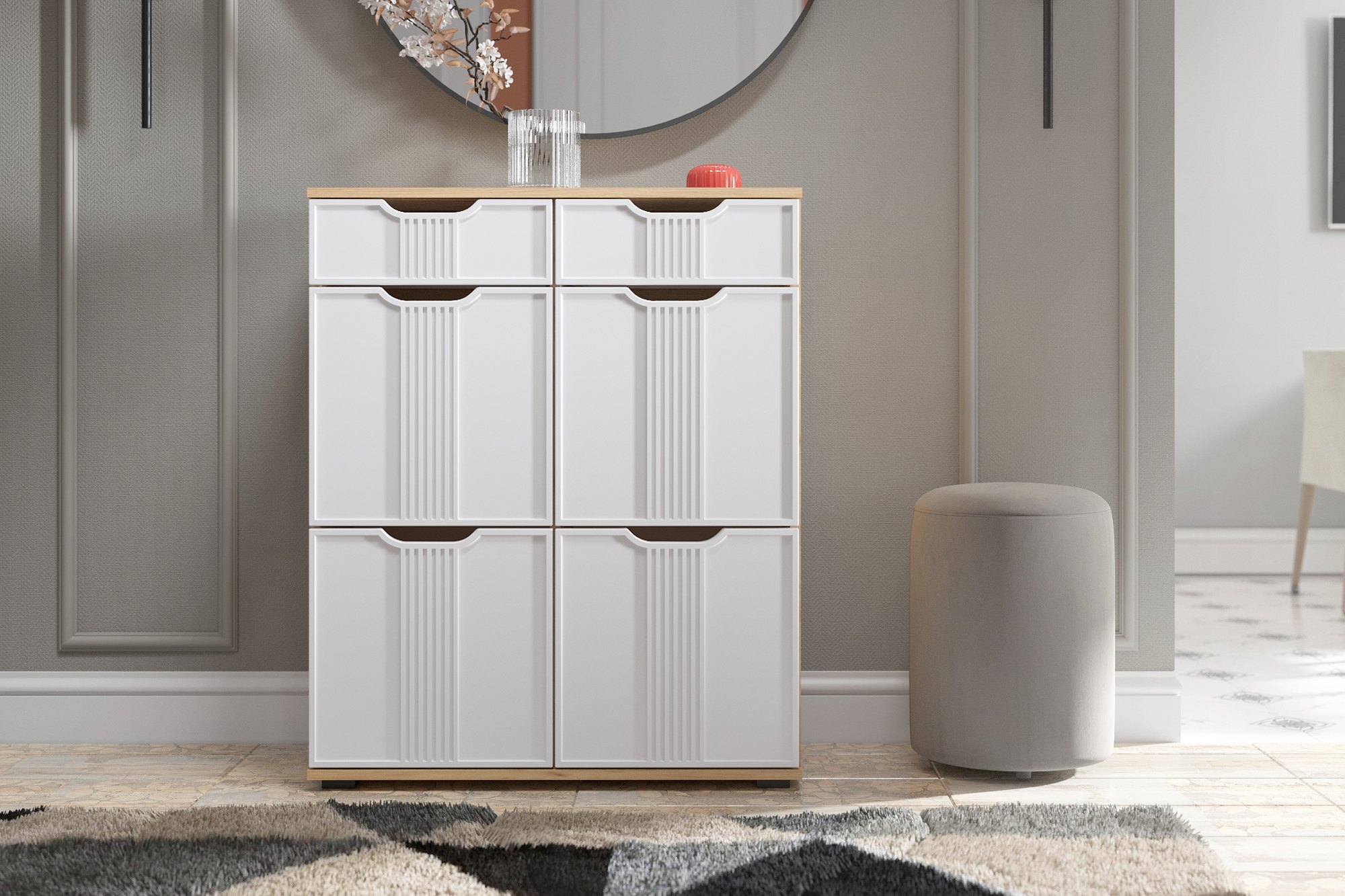 Комод Эмилия ЭЛ-20 изготовлен из ЛДСП 16 мм, фасады МДФ. Свес крышки в 30 мм обеспечит прилегание к стене с любым плинтусом. Фурнитура: телескопические направляющие полного выдвижения без доводчиков. Важная информация. Мебель доставляется в разобранном виде, в упаковках.