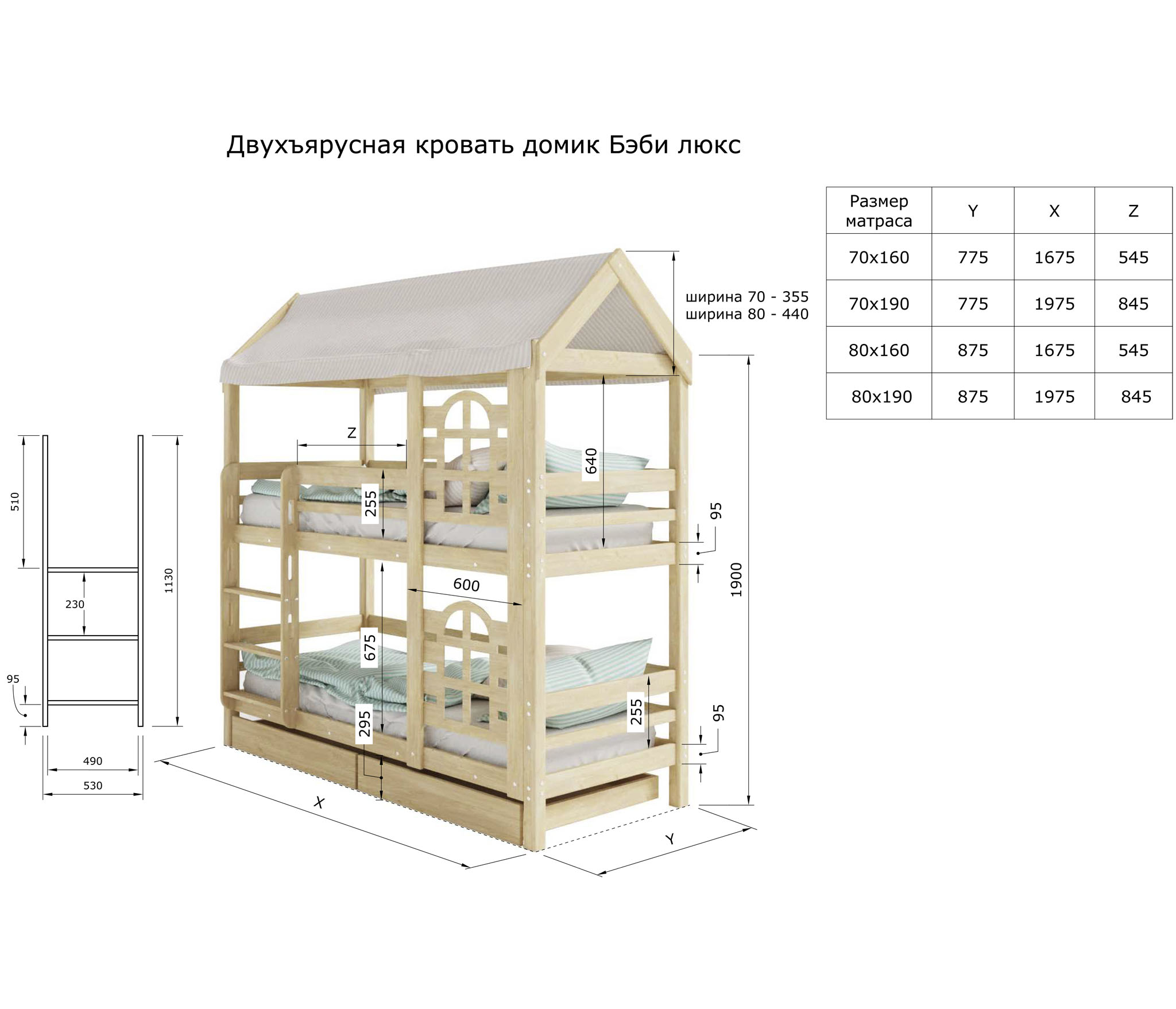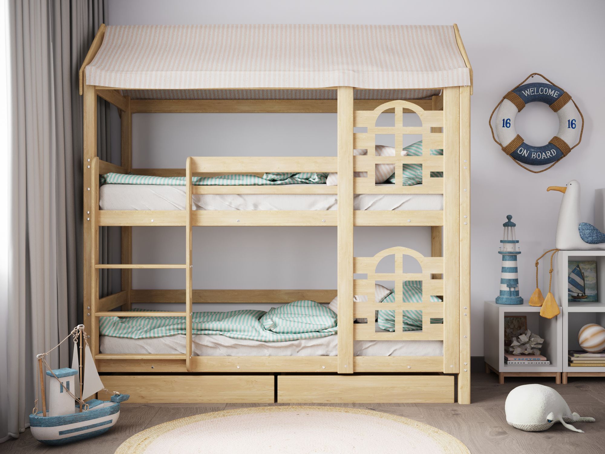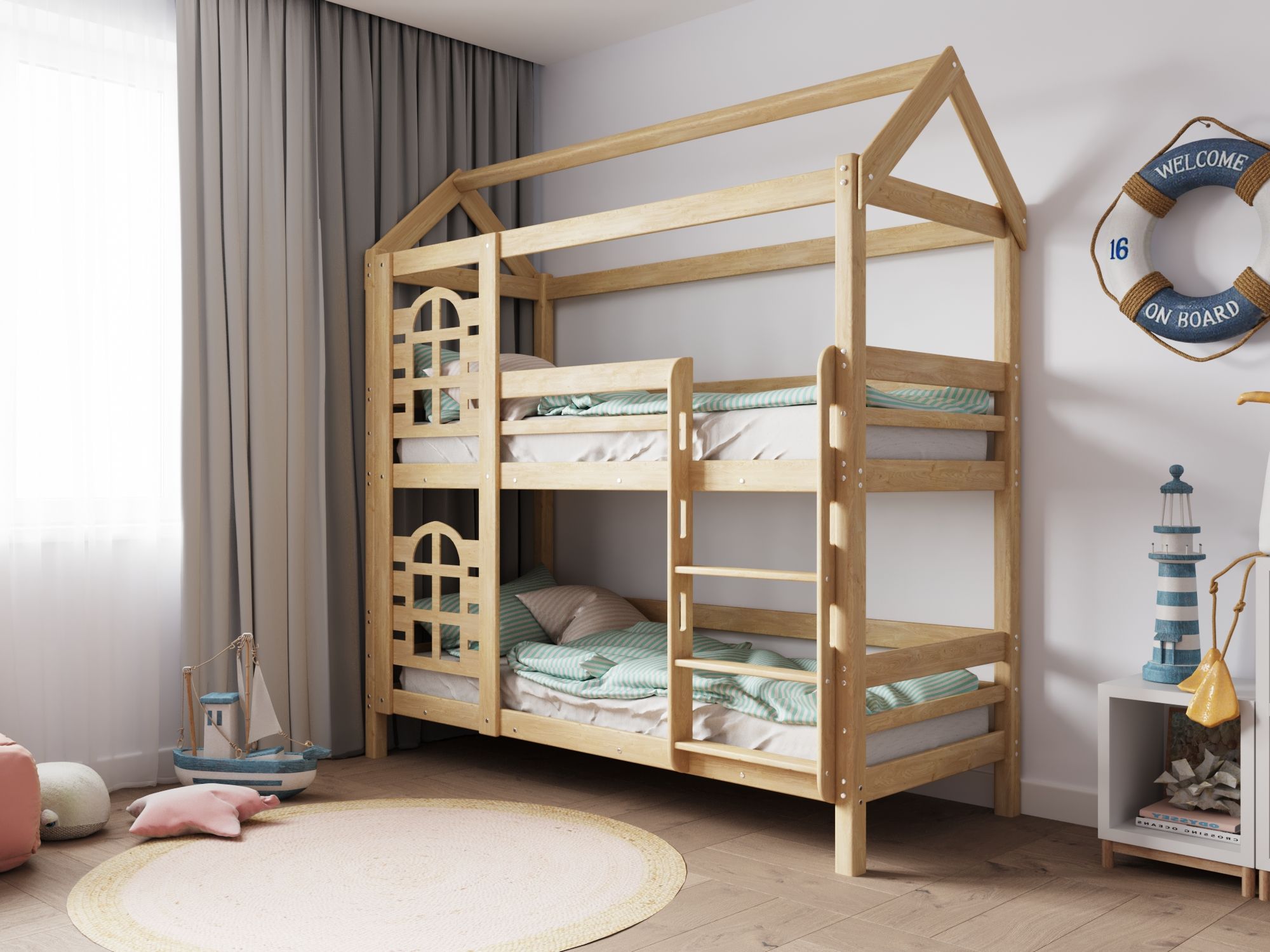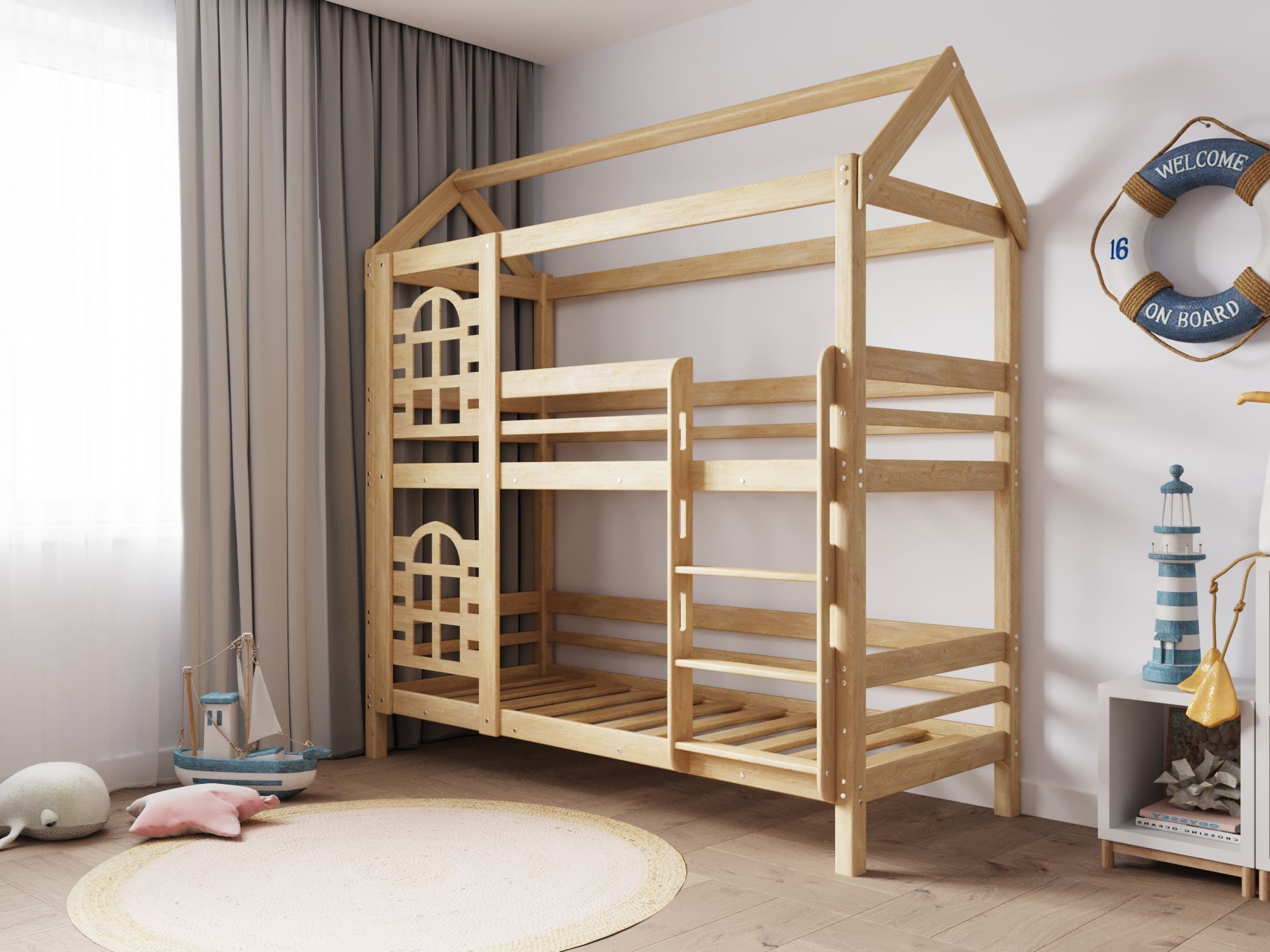 Модель двухъярусной кровати домика «Baby Lux» производится из массива натурального дерева без какого либо использования пропиток, лаков и красок, поэтому имеет высокую экологическую безопасность.