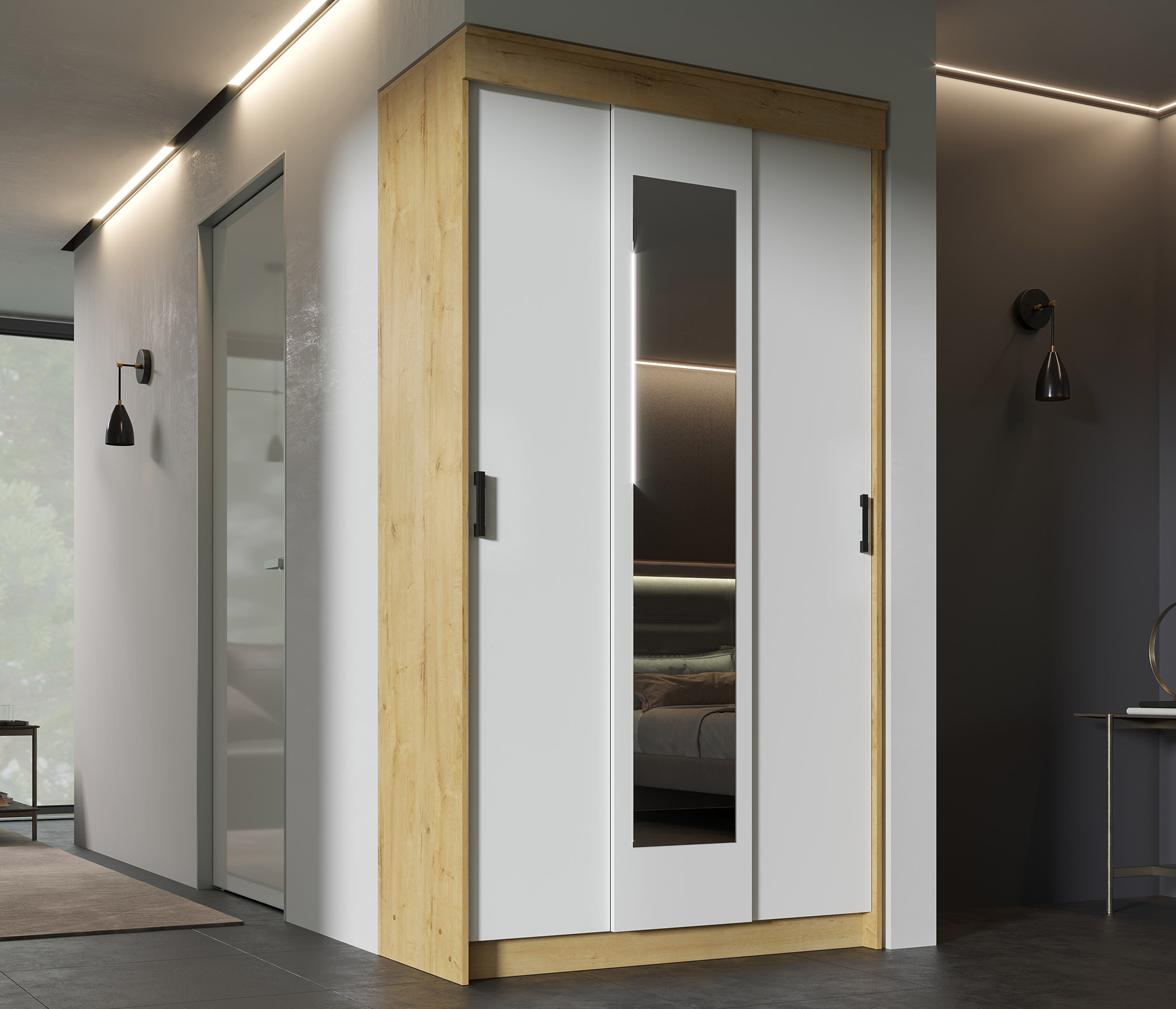 Внутри есть большое отделение со штангой для плечиков и поменьше — с полками. Центральный фасад шкафа-купе оформлен зеркальным полотном во весь рост, которое сделает пространство визуально больше.