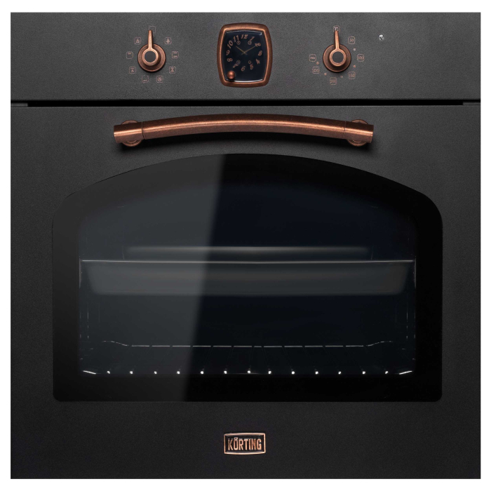Духовой шкаф в ретро-дизайне, аналоговые часы в классическом стиле Frank Muller с функцией времени, таймера и отключения, 8 режимов нагрева, объем духовки 64 л, телескопические направляющие на одном уровне, трехслойное остекление, каталитическая самоочистка, автоматическое отключение, в комплекте: Противень для выпечки, глубокий противень, хромированная решетка, цвет - матовый черный; цвет ручек - медь.