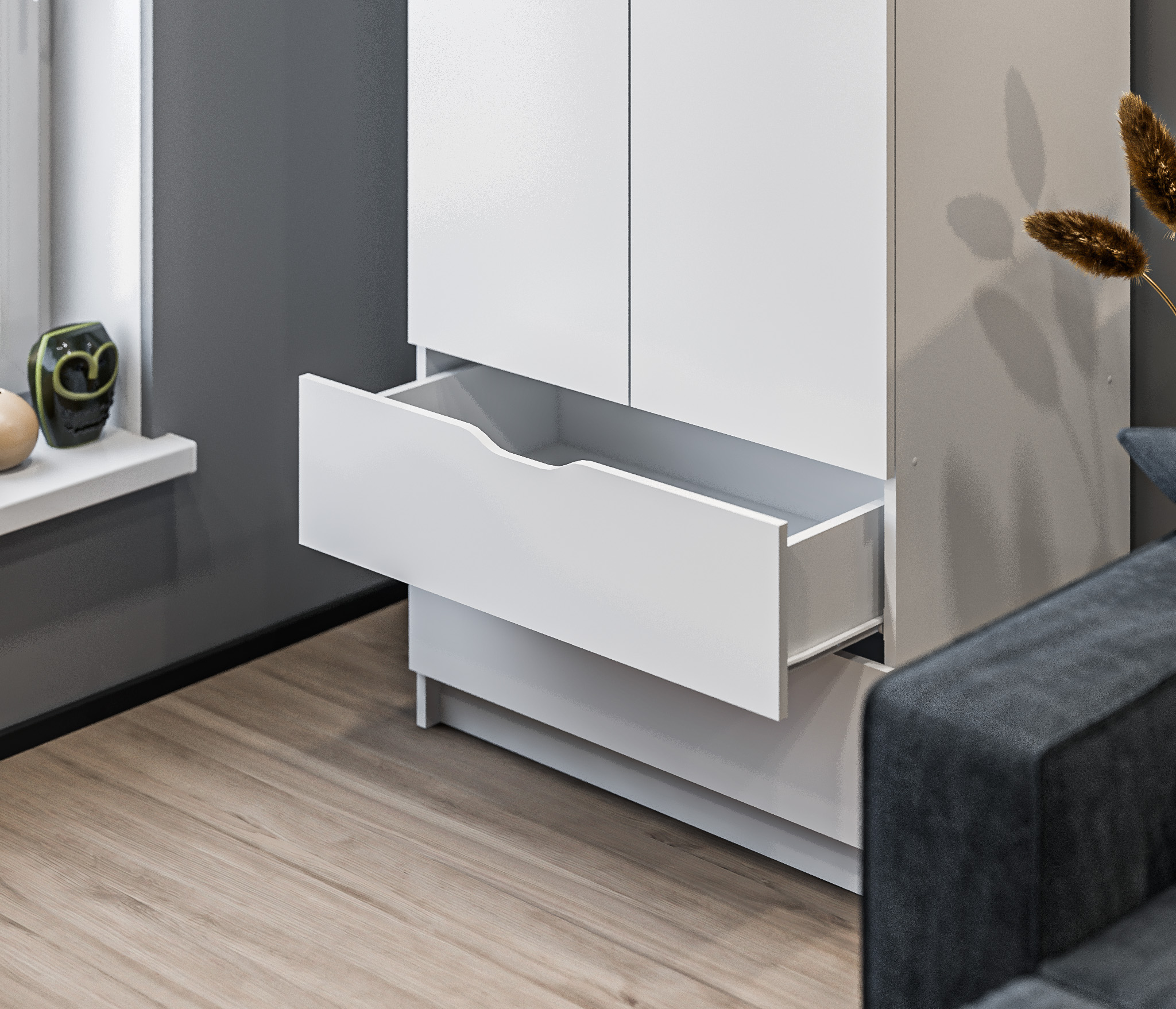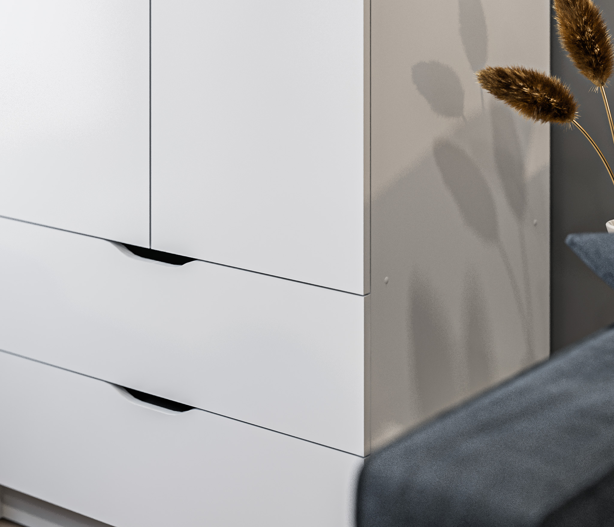 Дверцы шкафа не имеют ручек добавляют минималистичность в его дизайн.