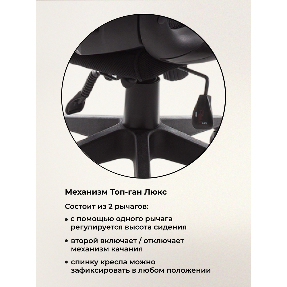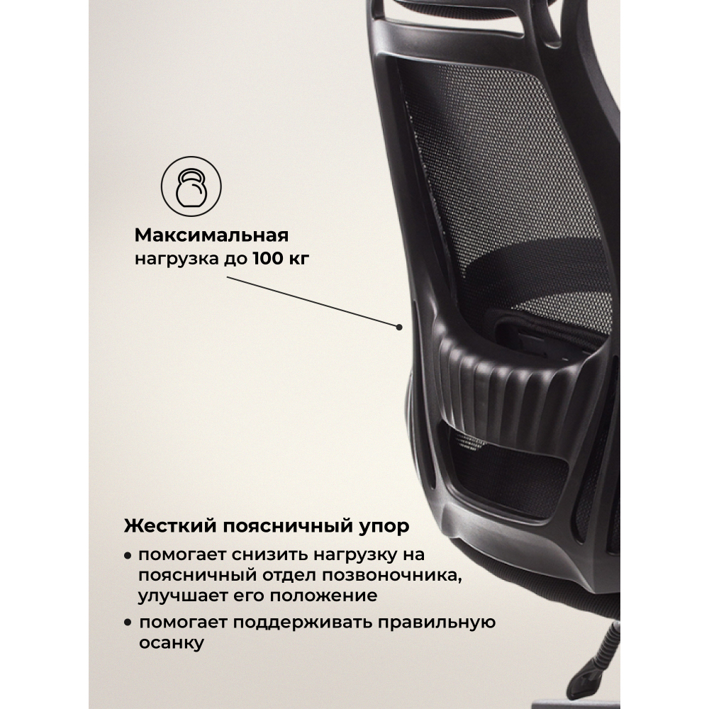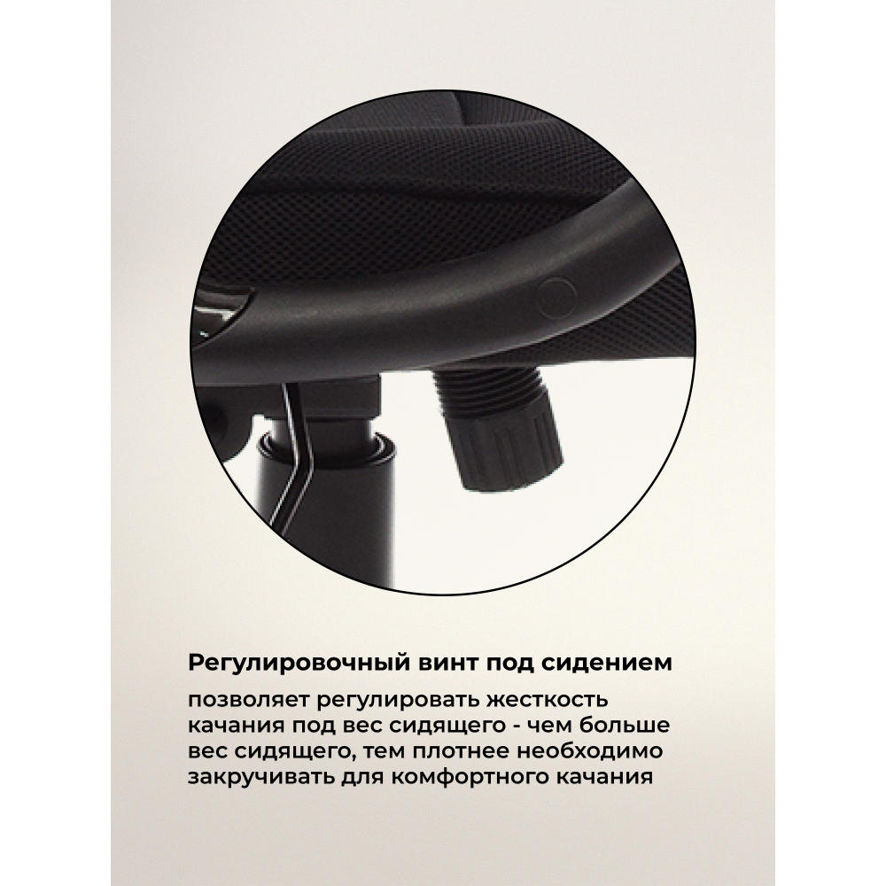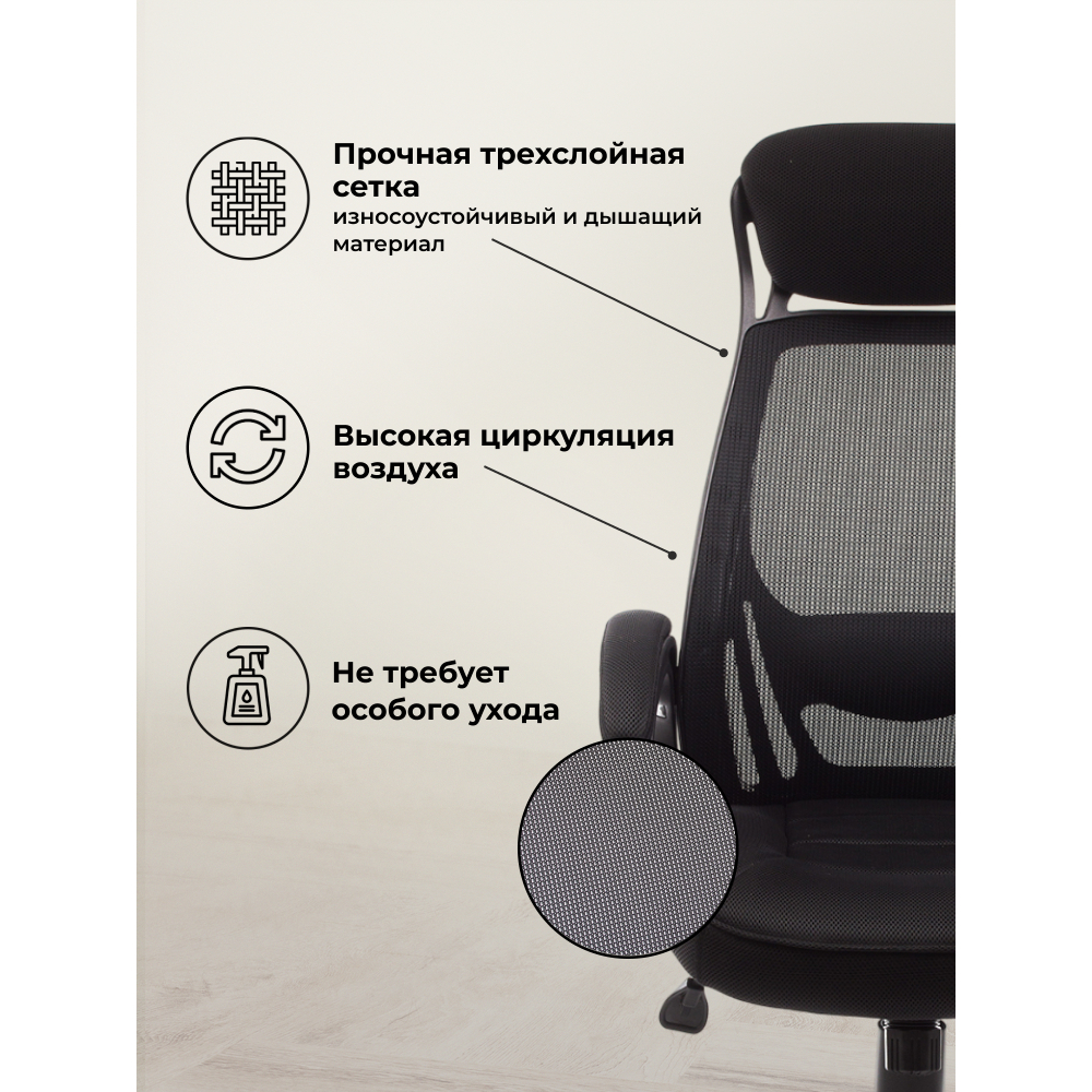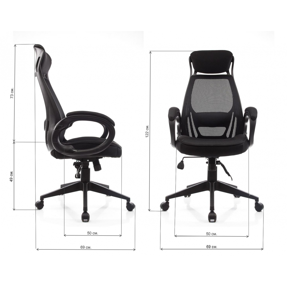 Материал каркаса - Пластик; Материал обивки - Сетка; Цвет каркаса - Черный пластик; Цвет обивки - Черный; Ширина - 69; Глубина - 69; Высота - 122; Ширина сиденья - 50; Глубина сиденья - 50; Высота сиденья - 49; Высота спинки - 73; Высота сиденья максимальная - 56; Высота максимальная - 129;