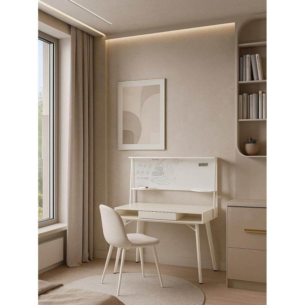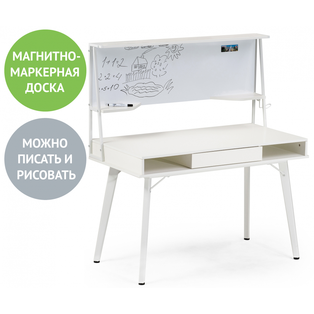 Используйте для записи только специальные маркеры, губки-стиратели и специализированные спреи. Материал каркаса - МДФ / Металл; Материал ножек - Металл; Материал столешницы - МДФ; Цвет каркаса - Белый; Цвет ножек - Белый; Цвет столешницы - Белый; Цвет подстолья - Белый; Ширина - 60; Высота - 134; Высота стола - 76; Длина - 120.