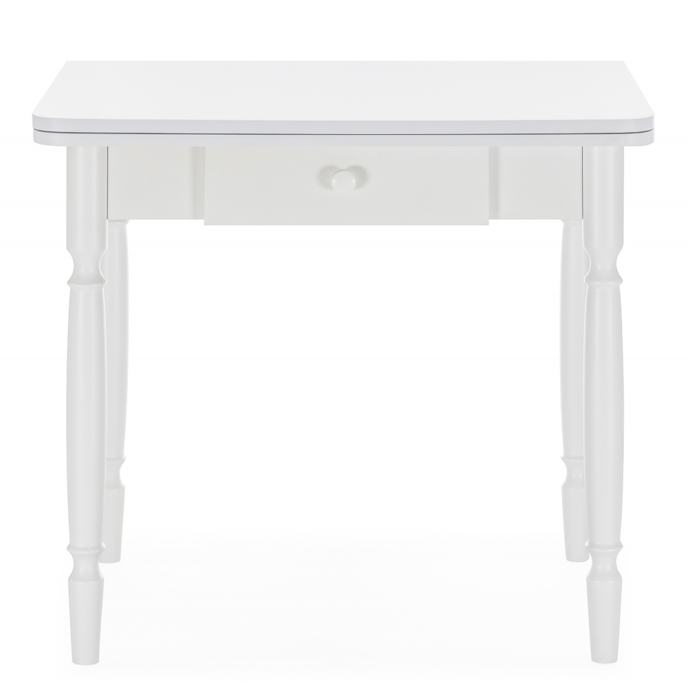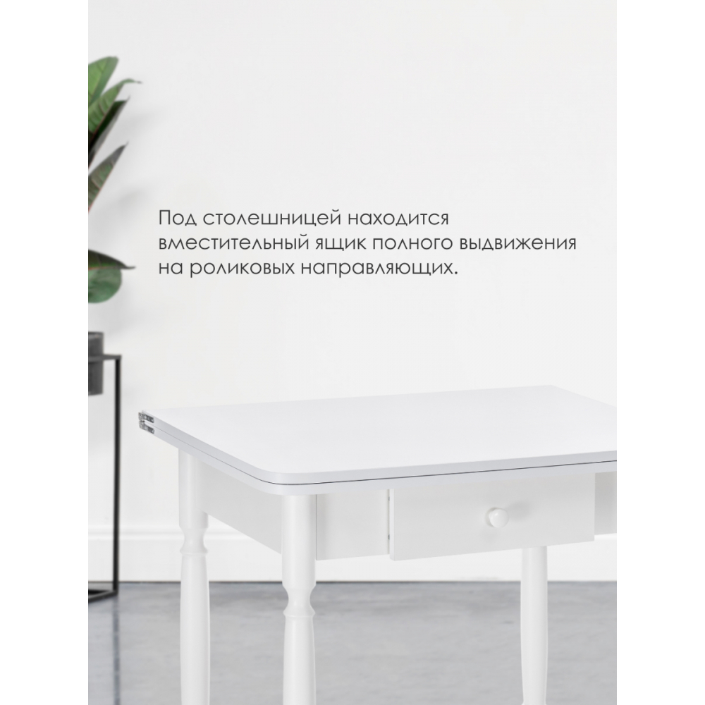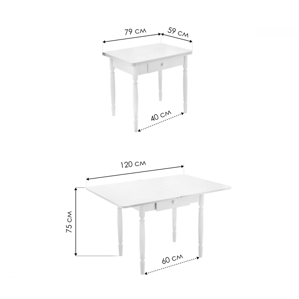 Расстояние между ножками по ширине: 41 см. Материал каркаса - Массив дерева; Материал ножек - Массив дерева; Материал столешницы - ЛДСП; Цвет каркаса - Белый; Цвет ножек - Белый; Цвет столешницы - Белый; Цвет подстолья - Белый; Ширина - 59; Высота - 75; Длина стола в разложенном виде - 120; Длина - 79.