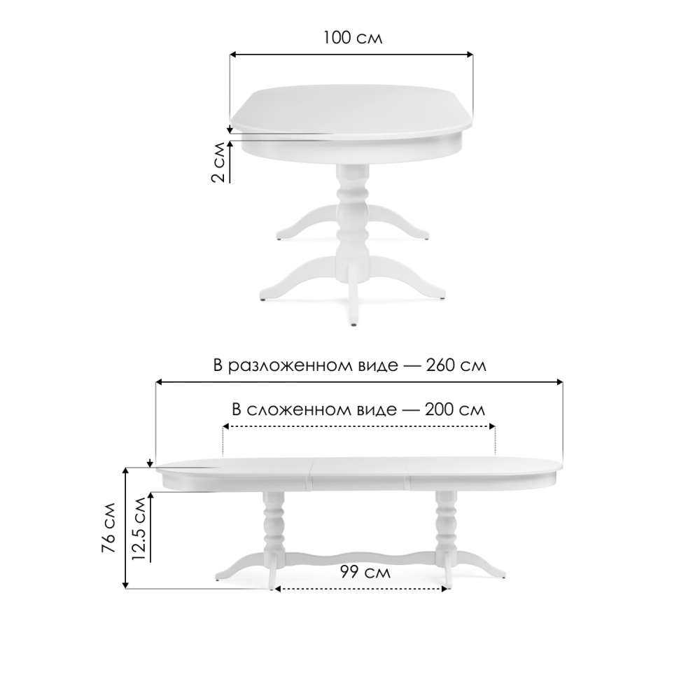 Толщина столешницы: 2 см. Материал каркаса - Массив бука; Материал ножек - Массив бука; Материал столешницы - Шпон / МДФ; Ширина - 100; Высота - 76; Длина стола в разложенном виде - 260; Длина - 200. Механизм раскладки - бабочка