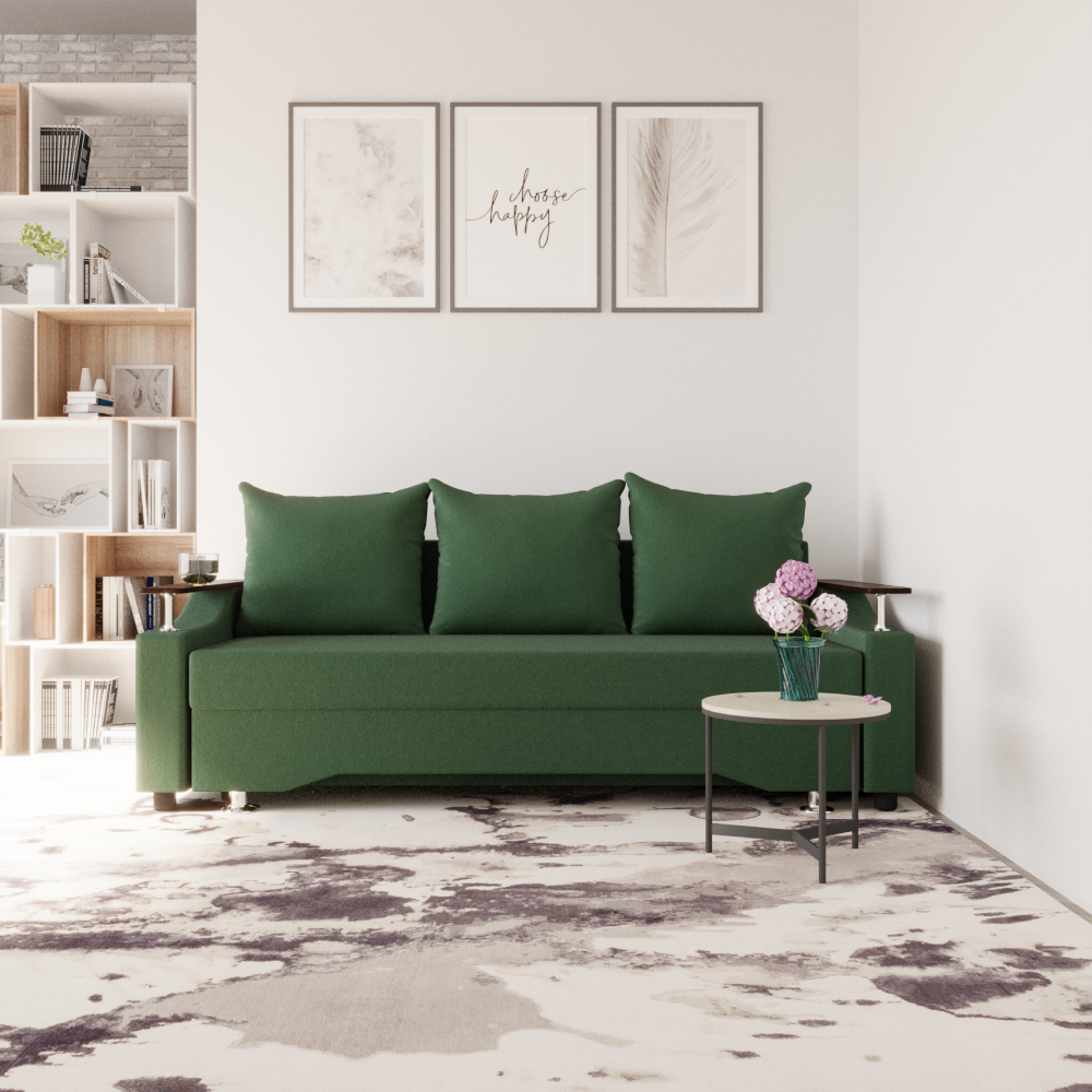Достоинства: ровное спальное место, лёгкость процесса трансформации дивана, ёмкий бельевой ящик, прочность механизма, долговечность конструкции.