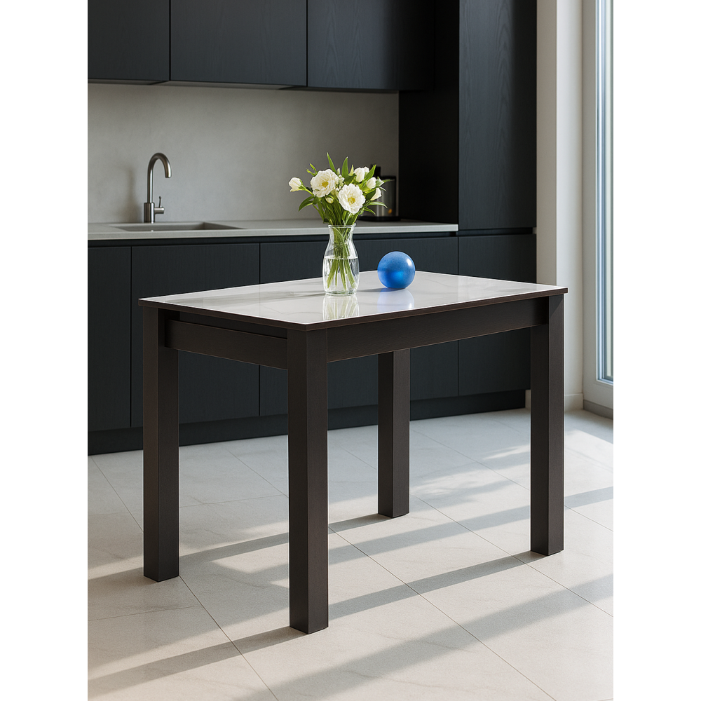 Толщина столешницы: 20 мм. Толщина закалённого стекла столешницы - 4мм. Толщина МДФ столешницы - 16мм. Материал каркаса - МДФ; Материал ножек - МДФ; Материал столешницы - Стекло; Цвет каркаса - Венге; Цвет ножек - Венге; Ширина - 70; Высота - 77; Длина - 100.