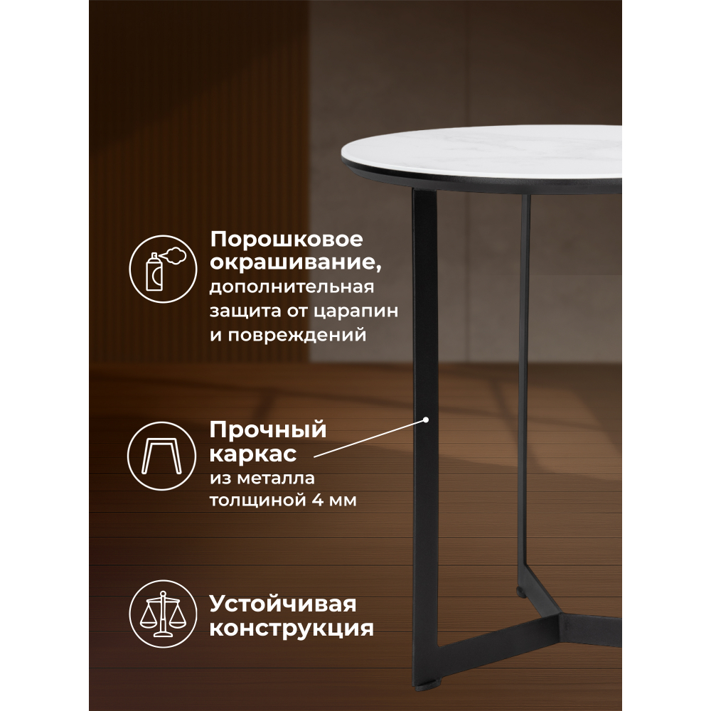 Толщина столешницы: 20 мм. Материал каркаса - Металл; Материал ножек - Металл; Материал столешницы - Стекло(под мрамор); Цвет каркаса - Черный; Цвет ножек - Черный; Ширина - 45; Высота - 50; Длина - 45.