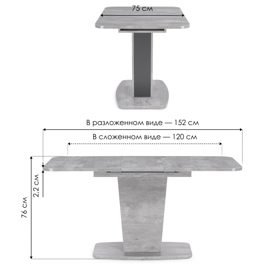 Толщина столешницы: 2,2 см. Материал каркаса - ЛДСП; Материал ножек - ЛДСП; Материал столешницы - ЛДСП; Ширина - 75; Высота - 75; Длина стола в разложенном виде - 152; Длина - 120.