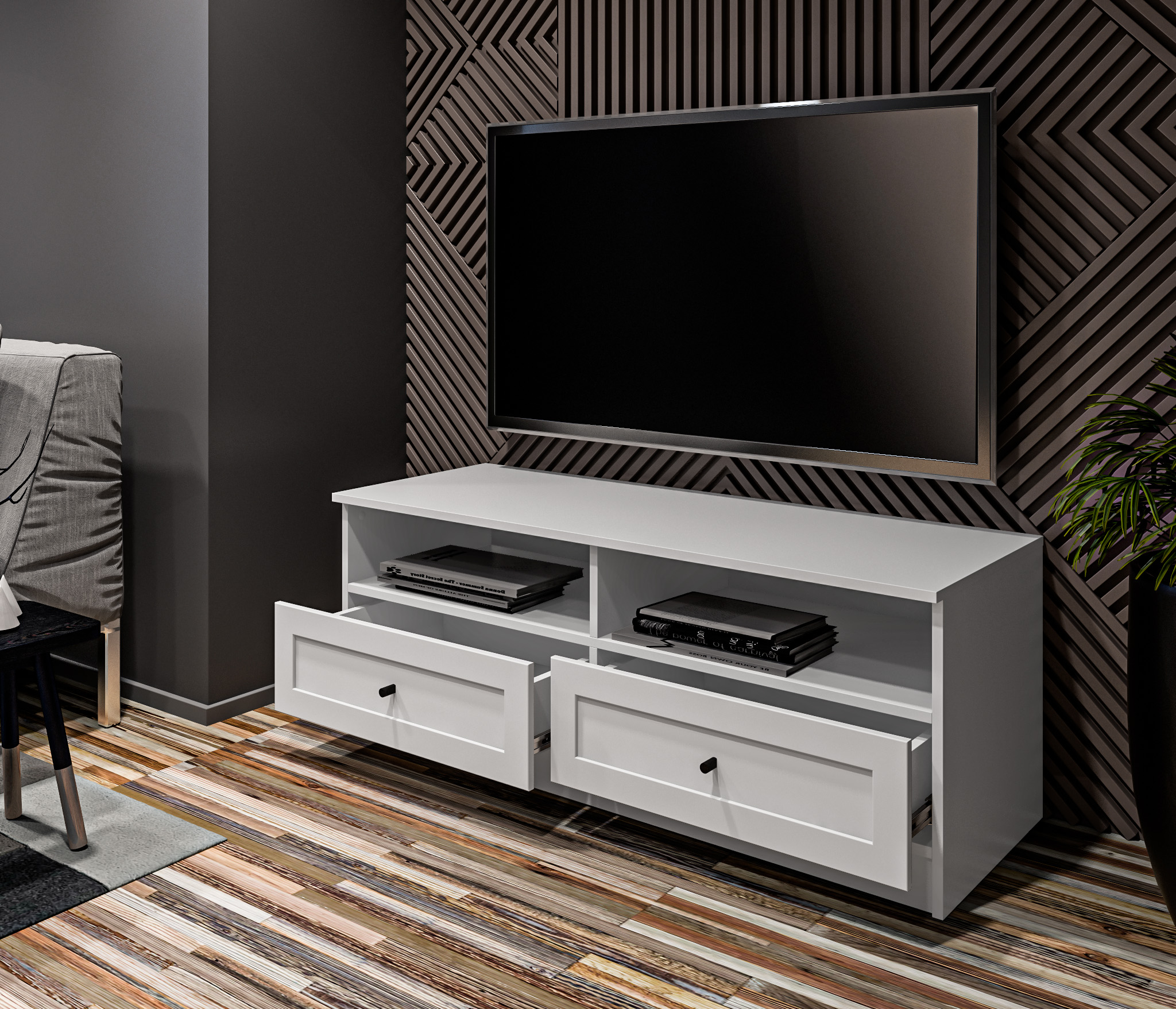 Продуманные детали делают использование тумбы максимально удобным: шариковые направляющие обеспечивают плавное выдвижение ящика.