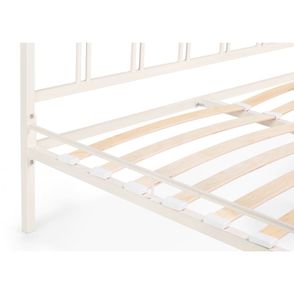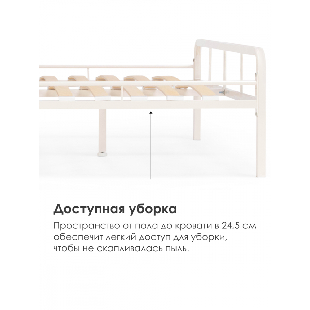 Материал каркаса - Металл; Материал ножек - Металл; Ортопедическое основание - в комплекте; Материал ортопедического основания - с деревянными ламелями; Цвет каркаса - Белый; Цвет ножек - Черный; Ширина - 126; Глубина - 206; Высота - 90,3; Размер спального места - 120 х 200; Длина кровати - 206; Ширина кровати - 126; Высота изножья - 46,3; Высота изголовья - 90,3.